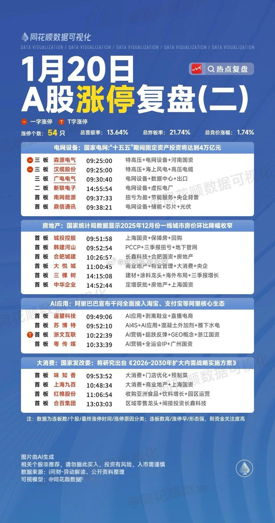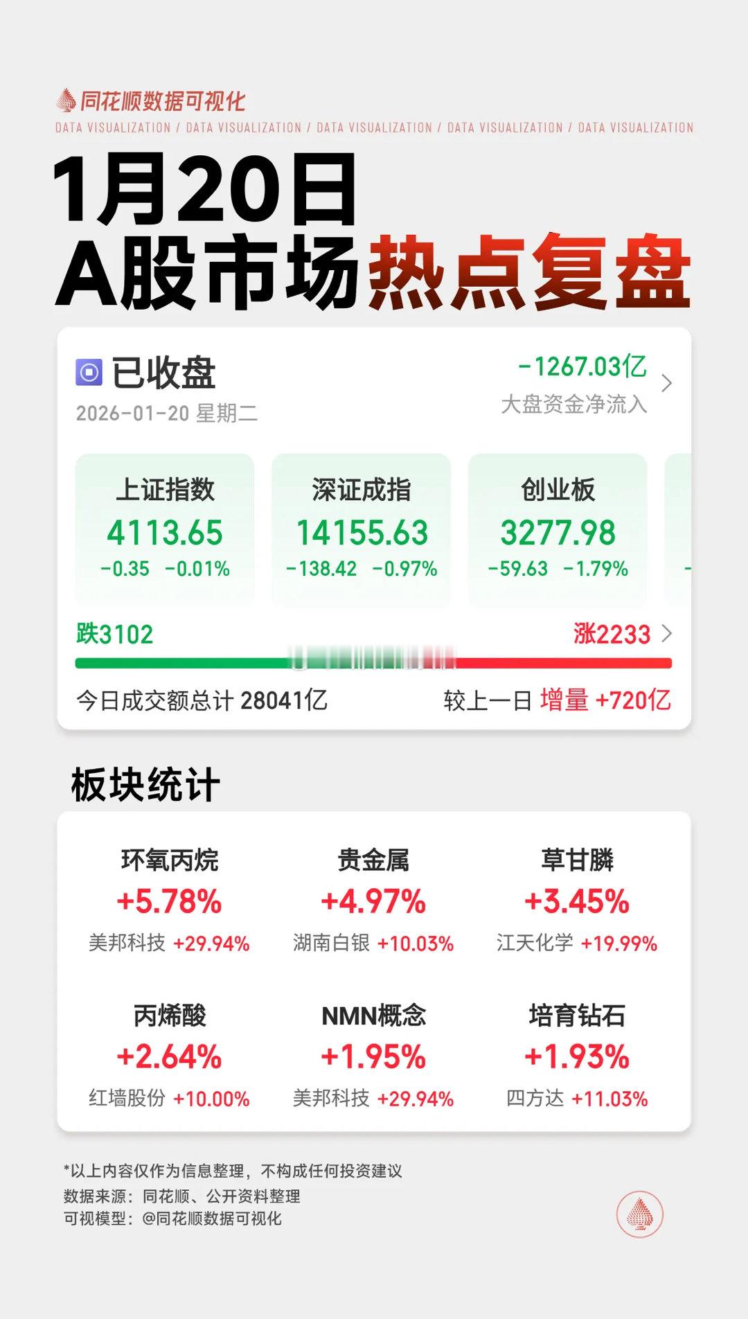 1月20日A股收评:三大指数集体收跌,创业板指一度跌超2%。沪深两市成交额2.78万亿,较上一个交易日放量694亿。盘面上,全市场超3100只个股下跌。从板块来看,化工板块逆势爆发,十余只成分股涨停,红宝丽、山东赫达、维远股份、红墙股份涨停。贵金属概念延续强势,湖南白银涨停。房地产板块表现活跃,大悦城、城投控股涨停。AI应用端局部走高,佳云科技、粤传媒、浙文互联涨停。下跌方面,算力硬件、商业航天等板块跌幅居前。其中商业航天概念股集体大跌,神剑股份4连跌停,航天动力2连跌停。截至收盘,沪指跌0.01%,深成指跌0.97%,创业板指1.79%。股市行情板块分化热门题材股市收盘点评股市技巧
