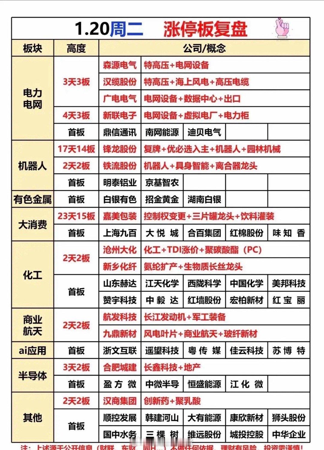 1月20日涨停梯队梳理:市场情绪活跃,热点呈现结构性延续性今日涨停个股覆盖电力电网、机器人、有色金属、大消费等多个领域,既有锋龙股份、嘉美包装这类超高度连板“妖股”,也有电力电网、机器人板块批量涌现的连板标的,首板数量充足。整体来看,市场情绪保持活跃,热点虽分散但结构性持续性凸显,连板梯队完整,资金在妖股抱团与板块轮动间灵活切换。个股梳理分析:1. 锋龙股份:17天14板的市场总龙头,凭借优必选入主叠加机器人、园林机械概念成资金抱团焦点,短期情绪溢价显著。后续需重点关注实控人变更后的业务协同效果,以及市场情绪能否持续。2. 嘉美包装:23天15板的消费板块高度标,主打控制权变更+三片罐龙头概念,受益于消费复苏与包装需求回暖,资金博弈激烈。新实控人的资源注入进度值得跟踪。3. 新联电子:4天3板的电力电网标的,聚焦电网设备+虚拟电厂+电力柜,受益于电网智能化升级与虚拟电厂政策落地,订单储备充裕,后续产能释放节奏是关键。4. 森源电气:3天3板的电力电网核心股,主打特高压+电网设备,沾光特高压建设提速与电网投资加码,技术实力突出,需关注订单落地及毛利率变动。5. 汉缆股份:3天3板的电力电网标的,覆盖特高压+海上风电+高压电缆,受益于海上风电装机增长与特高压项目推进,产能稳步释放,海外订单拓展情况值得留意。6. 广电电气:3天3板的电力电网标的,布局电网设备+数据中心+出口业务,受益于电网智能化与数据中心配套需求,出口业务韧性较强,海外市场表现需跟踪。7. 铁流股份:2天2板的机器人标的,主打机器人+具身智能+离合器龙头,切入具身智能核心零部件领域,技术壁垒高,下游客户导入与产能释放进度是看点。8. 沧州大化:2天2板的化工股,聚焦化工+TDI涨价+聚碳酸酯,受益于TDI价格回暖与化工品需求复苏,产能弹性大,产品价格走势需持续关注。9. 新乡化纤:2天2板的化工标的,主打氨纶扩产+生物质长丝龙头,氨纶行业处于周期底部,扩产与新品布局有望提升盈利弹性,行业供需格局变化是关键。10. 航发科技:2天2板的商业航天标的,覆盖长江发动机+军工装备,受益于航空发动机国产替代与C919产业链放量,技术领先,订单落地进度值得关注。11. 九鼎新材:2天2板的商业航天标的,主打风电叶片+商业航天+玻纤新材,切入商业航天3D打印领域,技术储备丰富,合资公司业务进展需跟踪。12. 汉商集团:2天2板的其他板块标的,聚焦创新药+聚乳酸,受人口数据催化引发辅助生殖相关关注,后续政策落地与业务拓展情况是重点。13. 合肥城建:3天2板的半导体标的,因间接持股长鑫科技切入存储芯片领域,受益于存储芯片周期回暖与国产替代加速,长鑫科技产能释放进度需关注。14. 鼎信通讯:首板电力电网标的,主打南网能源合作概念,受益于南方电网智能化升级与能源项目推进,业务协同性强,订单获取情况值得期待。15. 迪贝电气:首板电力电网标的,聚焦电网设备配套,受益于电网投资加码与设备更新需求,产品技术成熟,下游客户粘性与毛利率需留意。16. 明泰铝业:首板机器人标的,布局铝加工与机器人材料,受益于机器人产业爆发带来的材料需求增长,产能储备充足,业务放量节奏是看点。17. 京基智农:首板机器人标的,切入机器人养殖设备领域,依托农业产业资源与技术积累形成差异化优势,项目落地与盈利兑现情况需跟踪。18. 白银有色:首板有色金属标的,主打白银+黄金,受益于贵金属价格创历史新高,资源储备丰富,金属价格走势与产能释放需关注。19. 招金黄金:首板有色金属标的,聚焦黄金开采与冶炼,受益于金价上涨与避险需求提升,业绩弹性大,金价波动对盈利的影响需留意。20. 湖南白银:首板有色金属标的,主打白银期货创新高概念,受益于白银价格上行,业务布局完善,贵金属行情延续性与业务多元化进展值得关注。21. 上海九百:首板大消费标的,聚焦商业零售+大悦城概念,受益于消费复苏与线下客流回暖,门店布局优化,节日消费旺季的业绩表现是看点。22. 大悦城:首板大消费标的,主打商业地产+消费运营,受益于消费升级与商业场景复苏,项目储备充足,租金收入与客流恢复情况需跟踪。23. 合百集团:首板大消费标的,布局百货零售与商超,受益于县域消费复苏与渠道下沉,区域优势明显,新店拓展与供应链优化值得关注。24. 红棉股份:首板大消费标的,主打纺织服饰+国货品牌,受益于国潮消费崛起与线下渠道恢复,品牌力逐步提升,新品推广效果需留意。总结:当前涨停板梯队完整,市场情绪活跃,既有锋龙股份、嘉美包装等“妖股”引领的情绪行情,也有电力电网、机器人等板块依托产业逻辑的驱动行情。热点虽分散但结构性持续性较强,投资者可结合连板高度、板块景气度与个股基本面筛选标的,同时需警惕短期情绪退潮可能带来的波动风险。本文涉及资讯数据等内容来自网络,仅供参考,不构成投资建议!