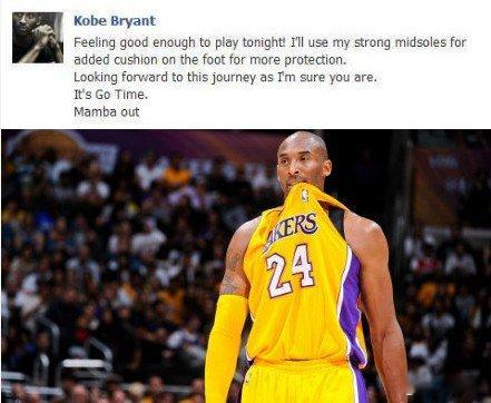 【科比亲自确认出战NBA揭幕战】10月31日讯,科比能否出战NBA常规赛揭幕战一直是疑云,就在湖人队和小牛队首场常规赛赛前,科比更新了个人的facebook:“我感觉不错,今天能够上场!”今天黑曼巴不会缺席湖人队的揭幕战!
