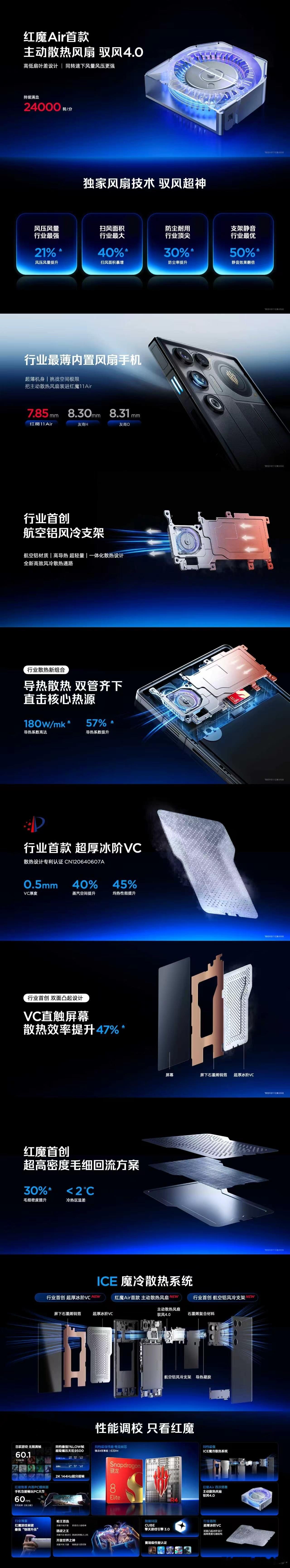 好家伙,电竞手机也卷轻薄赛道了?!今天发布的红魔11 Air在7.85mm超薄机身里,塞了骁龙8至尊版+红芯R4双芯、主动散热风扇、超厚冰阶VC和7000mAh大电池,玩游戏久了也不烫手,长时间畅玩也没有续航焦虑。还有520Hz肩键和6.85英寸全面屏,游戏更沉浸。原来游戏手机也可以兼顾性能与设计的嘛~