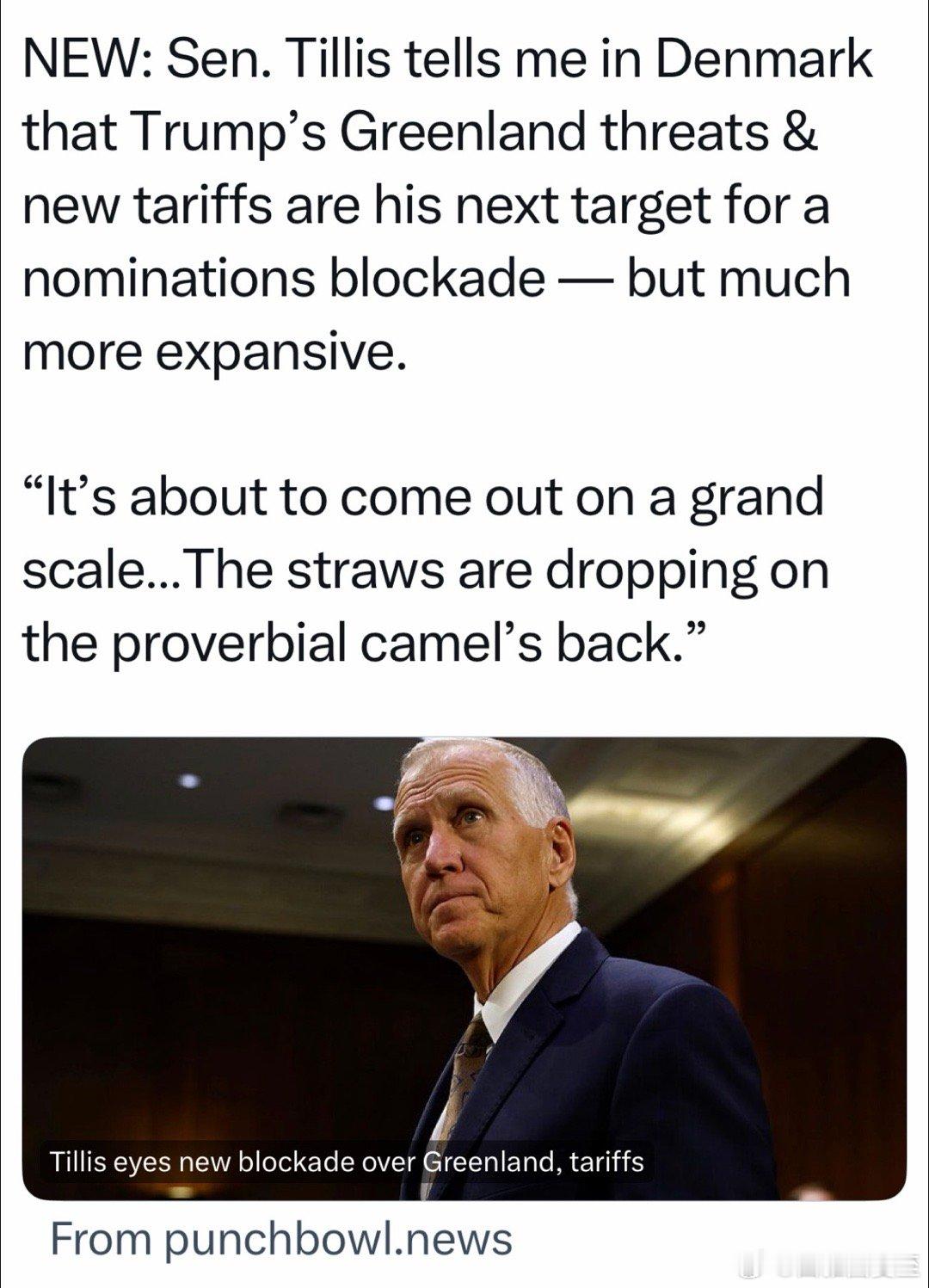 正在丹麦访问的美国联邦参议员:总统的各种人事任命,在参院的“提名投票”,会大规模受阻…格陵兰、新关税,是压倒骆驼的最后一根稻草Tillis是共和党,决定不再竞选连Ren 他的位置,民主党竞争者是前州长,目前民调优势24个百分点