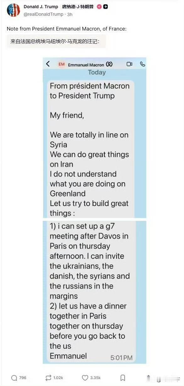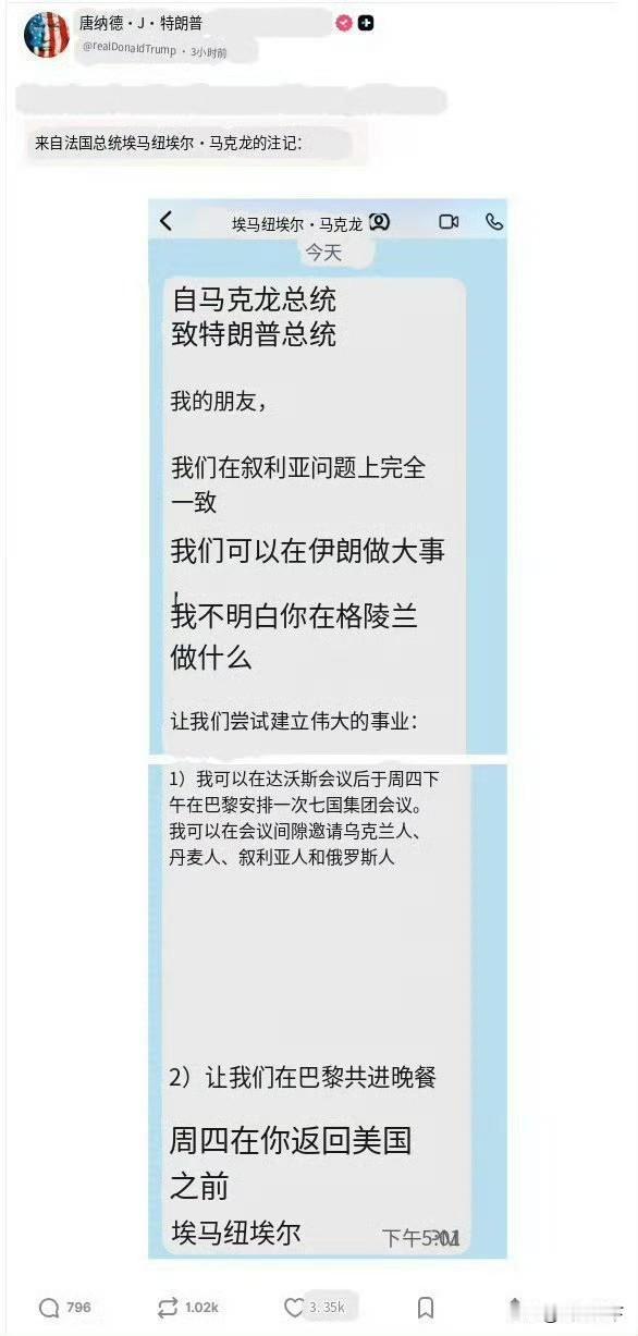 马克龙把特朗普放心上,没想到特朗普把马克龙挂网上,特朗普发帖把马克龙发给他的短信内容曝光在网上,在短信中,马克龙邀请特朗普“在伊朗做大事”,说“不明白特朗普在格陵兰岛做什么”。 意思就是让特朗普搞伊朗,别搞格陵兰岛,有点祸水东引的意思,结果被特朗普曝光了,政客的嘴脸就是这么丑陋,马克龙真够小人的[笑哭][笑哭]