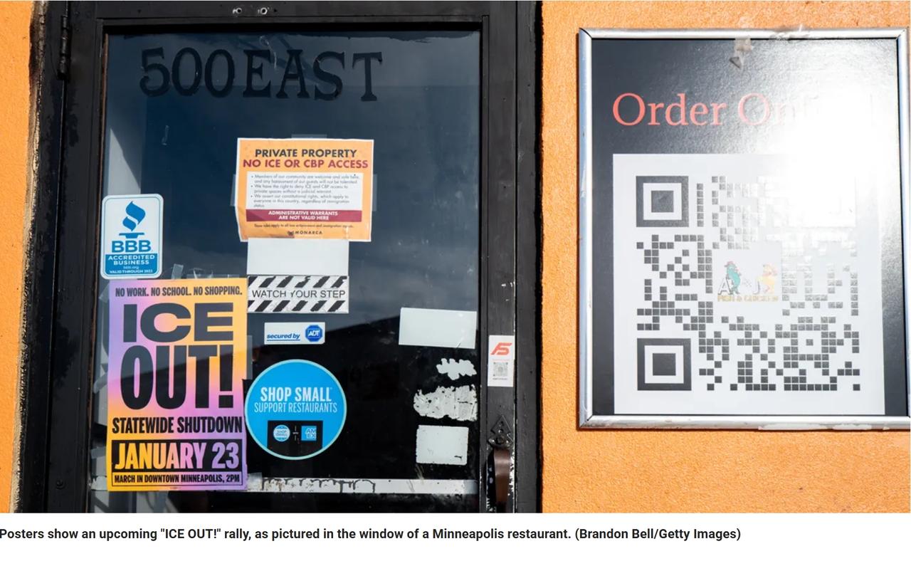 美国明尼苏达州数十家餐厅计划于周五关闭,以抗议ICE的执法 明尼苏达州双子城的多家餐厅、酒吧和咖啡馆计划于周五参与“经济停摆”罢工,以回应特朗普的移民执法政策。还有很多餐饮企业禁止ICE特工进入。 明尼苏达移民权利行动委员会于1月13日宣布了“ICE Out”,该组织在其网站上自称是一个“全志愿者、草根、多种族和多国籍移民权利的群众运动组织”。 街头餐厅Hola Arepa和Hai Hai在联合Instagram账号上表示,“支持将ICE从我们城市中驱逐出去、为Renee Good讨回正义的总罢工。” Wildflyer Coffee在Instagram上表示,其两家门店将关闭,“以确保员工能够以对他们有意义的方式参与,并进一步与运动保持团结”。 圣保罗的一家咖啡馆Lost Fox在Instagram上宣布将关闭,“以声援明尼苏达州ICE OUT”——并鼓励其他人参与游行。 一家阿根廷意大利餐厅Martina在其Instagram页面上发布消息,表示将参与此次罢工。“基于与团队成员多次有意义的交流,我们决定于1月23日星期五关闭Martina。我们将在周六恢复正常服务。“ 位于阿诺卡县的Metta Coffee在其Facebook页面上写道:“为了与同业同仁团结,我们的咖啡店和书店将于周五关闭。我们反对对我们国家的入侵和政治腐败。我们呼吁移民执法局停止入侵并撤离明尼苏达。不工作,不上学,不购物。” Bull's Horn酒吧在Instagram上写道:“我们与移民社区和邻居站在一起,并将因'ICE Out'抗议而关闭。” 一些企业也张贴了告示,声明联邦特工不得进入其场所。 明尼阿波利斯一家加油站门口的告示写道:“联邦特工(ICE、DEA、ATF或其他任何代理人或机构)不得进入、停放或在本物业上进行移民作。” Rancho Loco Grill & Bar在门上挂了一块牌子,上面写着:“ICE不受欢迎。” 明尼阿波利斯一家咖啡馆张贴了一块告示牌,表示联邦特工“不得进入场所”,员工无权允许ICE进入该店。