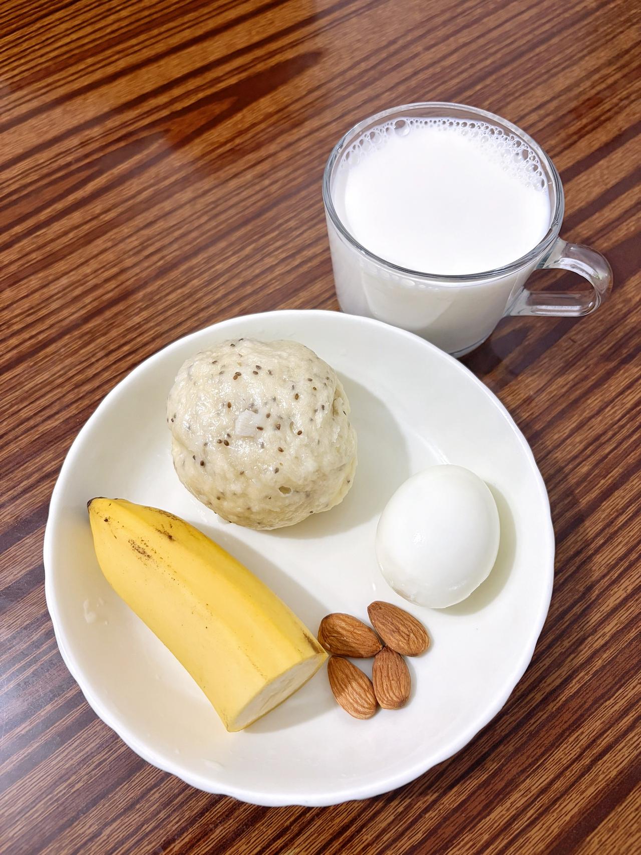 自律减脂健康餐,目标103斤,加油 今日体重:104.3斤⬇️0.1斤 今日减脂早餐:山药奇亚籽馒头+香蕉+鸡蛋+坚果+牛奶 体重管理 自律减脂健康餐