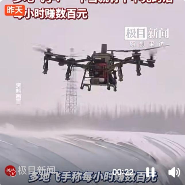 多地降雪催生无人机除雪热 飞手时薪数百元订单排满 近日,河南、安徽、江苏、湖北等多省遭遇强降雪,积雪压顶威胁蔬菜大棚、车间厂房安全,无人机除雪服务需求呈爆发式增长,成为冰雪天里的“空中清雪利器”。 1月20日,安徽宿州一家无人机服务公司工作人员向记者介绍,降雪以来咨询量激增,业务覆盖塑料大棚、厂房棚顶及道路除雪,普通塑料大棚除雪均价约200元,面积大的按实际情况加价。河南许昌飞手透露,当地按小时计费,大棚除雪时薪达300元,“一下雪就订单不断,根本干不完”。 无人机除雪主要通过叶片扇动、加装吹雪设备或喷洒融雪剂三种方式,效率远超人工,十人半天的工作量无人机半小时即可完成。但高收入背后暗藏风险,河南驻马店飞手表示,低温天气影响设备稳定性,操作不当易致“机毁棚损”,且订单集中在降雪期,雪停后需求骤减。 目前,多地飞手昼夜赶工应对激增订单,这一新兴服务既为应急除雪提供了高效方案,也暴露出行业规范与风险保障不足的问题。无人机飞手收入 无人机月薪