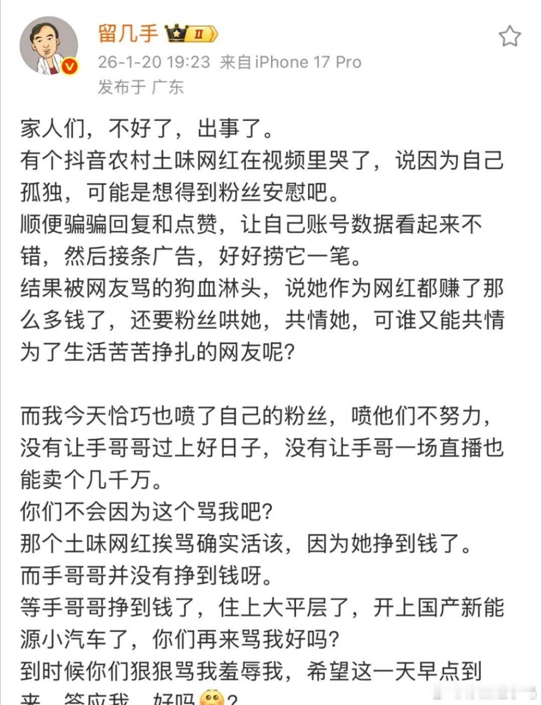 阿爆就发哭视频那事儿出来道歉了,可网友压根不买账。这边道歉的热乎劲儿还没过去,留几手直接发文爆料,说阿爆这波操作就是为了捞钱——发哭视频博同情,拉一波热度让数据好看点,好方便接广告赚钱,根本不值得可怜。网友一听留几手这话,之前憋的气瞬间顺了,不少人还开始调侃留几手:“行啊你,这波是一点没饶过她。”说实话,留几手嘴巴是毒,但说的大都是实在话,句句带刺还夹着反讽,今天算是明白他当初为啥能火了——这吐槽精准又解气,可不就戳中大家的点了嘛。