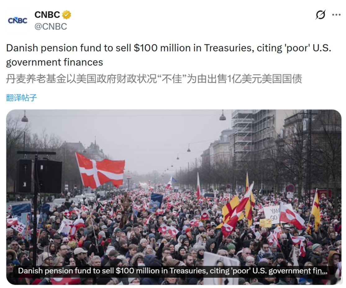 丹麦养老基金以美国政府财政状况“不佳”为由出售1亿美元美国国债。特朗普:格陵兰岛的收购价降低2亿美元。