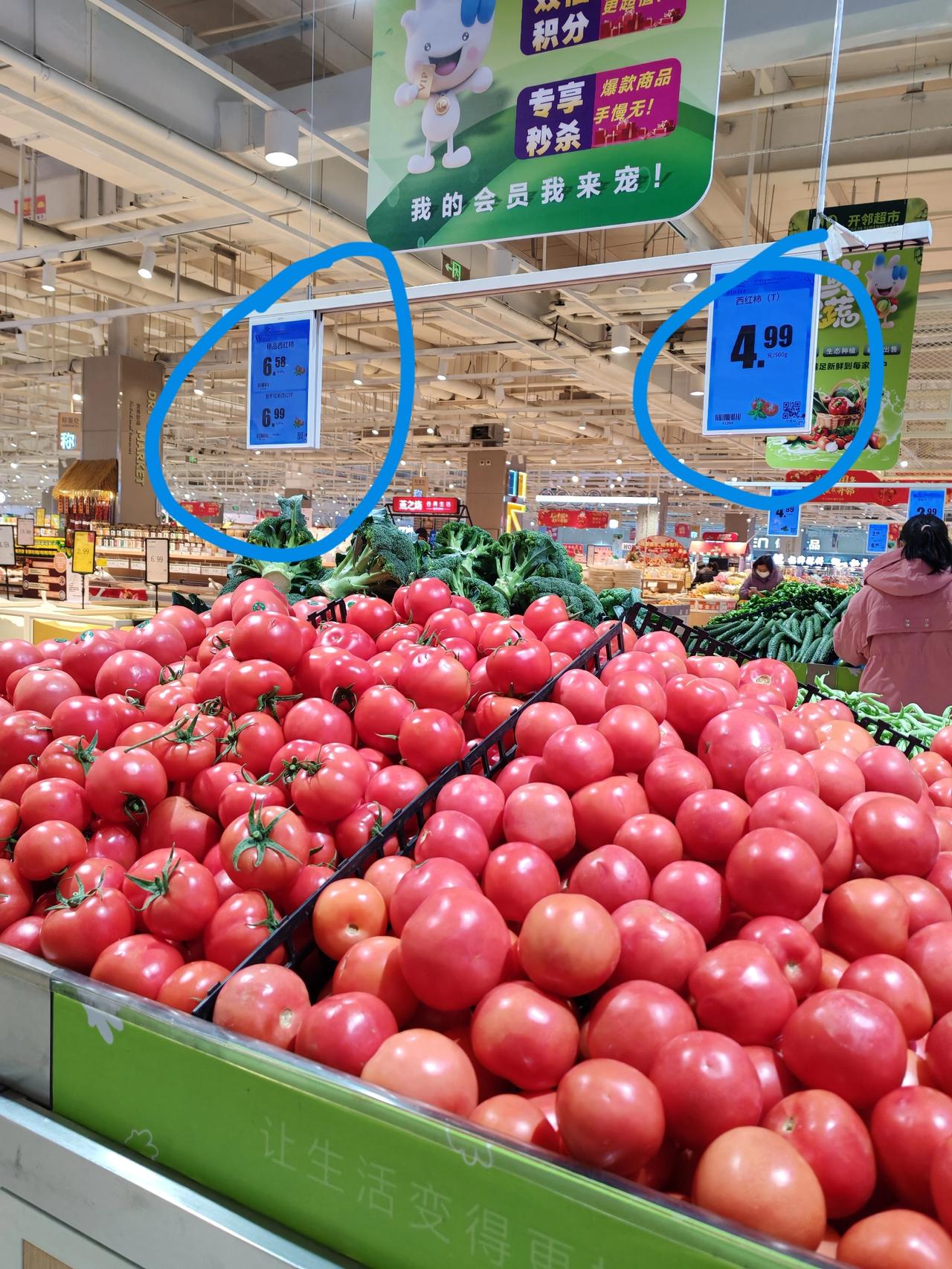 雪还没化,西红柿降价了 1月21日,坐标西安。这会儿我来买超市给办公室买打印纸,顺带看了一下蔬菜,发现西红柿价有些意外。 蔬菜区卖的三种西红柿,分别为4.99元,6.58元,6.99元,其中普罗旺斯西红柿为6.99元,我们西安本地人叫水果柿子。 上周我买过西红柿,就是陕西本地泾阳水果西红柿,价格为7.99元,今天卖4.99元那种西红柿上星期卖5.58元,才过了几天价格就降了,虽然降幅不大,但价格在下行,对市民来说就是好事。 关中人喜欢西红柿,是老百姓餐桌上的万能搭子,西红柿炒鸡蛋,西红柿炒菜花,西红柿炒包菜,西红柿炒西葫芦,啥菜都可以放,关键是放进去还挺好吃。 临近年关,期待菜价平稳,这几天我比较忙,没空看,不知道市场上近几天西红柿普遍都降价了吗?西红柿