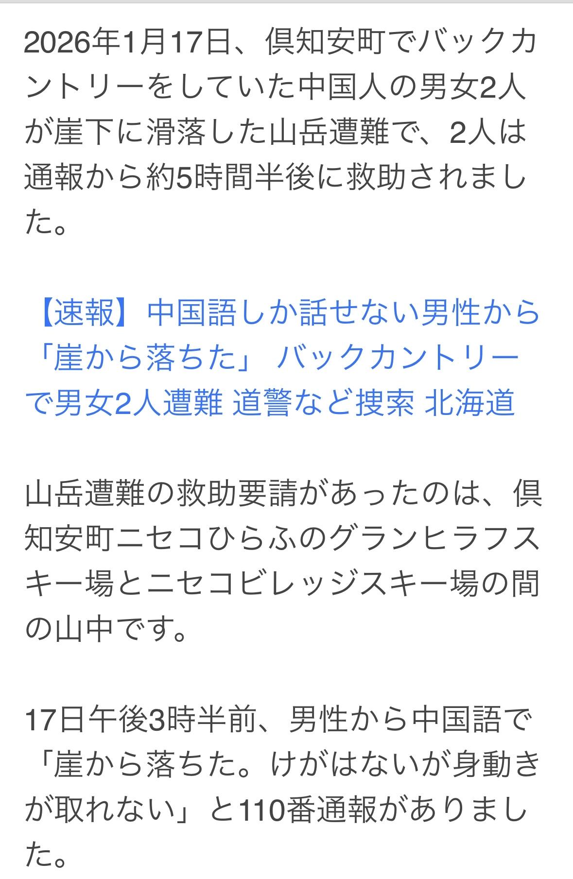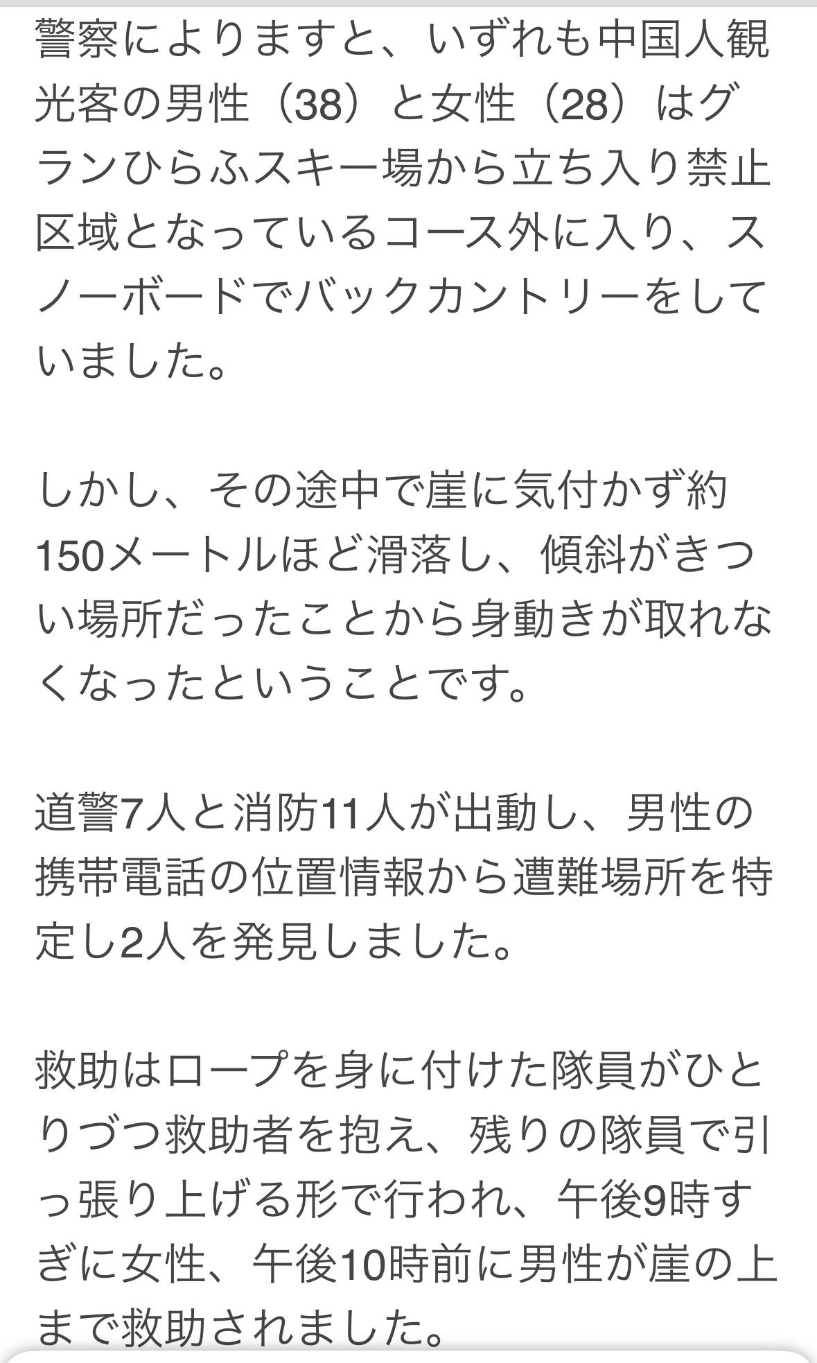 17日下午,两名中国游客一男(38岁)一女(28岁)在北海道俱知安町滑雪滑,后滑入新雪谷场外的禁区,从150米高处坠落,由于坡度陡峭而无法移动。 下午3点半男子用中文报警,北海道7名警员和11名消防员前往现场,根据男子手机定位确定了救援地点。救援人员身系绳索将他俩依次拖上来,两人在当晚10点之前获救。 两人没有受伤,就是感觉冷。不过,这段经历应该是温暖的。在异国他乡获救正常人是不会忘记的!