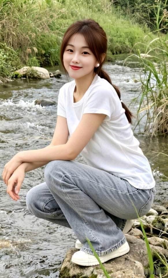 在森林里,她用双手比出爱心,微笑着蹲在水边,自然又甜美。
