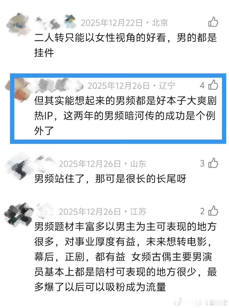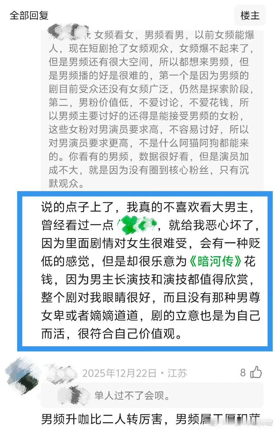 《暗河传》的成功在于下沉市场,龚俊的颜值和演技大出圈,真正的大男主从来都不是唱独角戏,每一个角色都会有自己发光点,演员上桌全凭本事,而一番大男主则是整部剧的桌,《暗河传》女性角色都是独立的,从来都不是依附别人而生,所以《暗河传》的成功不仅仅是靠演员,剧本也写的非常好!暗河传