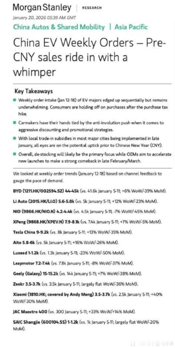 现在周榜没了,不过根据大摩的研究报告,小鹏应该是新年第一月前3周新势力第一。对比去年同期,每个车企降幅都很大,平均差不多-35%到-40%的降幅,小鹏仅-5%小鹏汽车