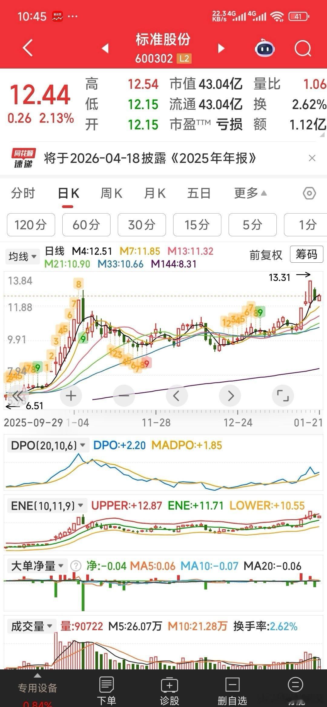 标准股份,上午收盘12.51元,离关键价位12.58元仅差7分。下午依然关注干掉