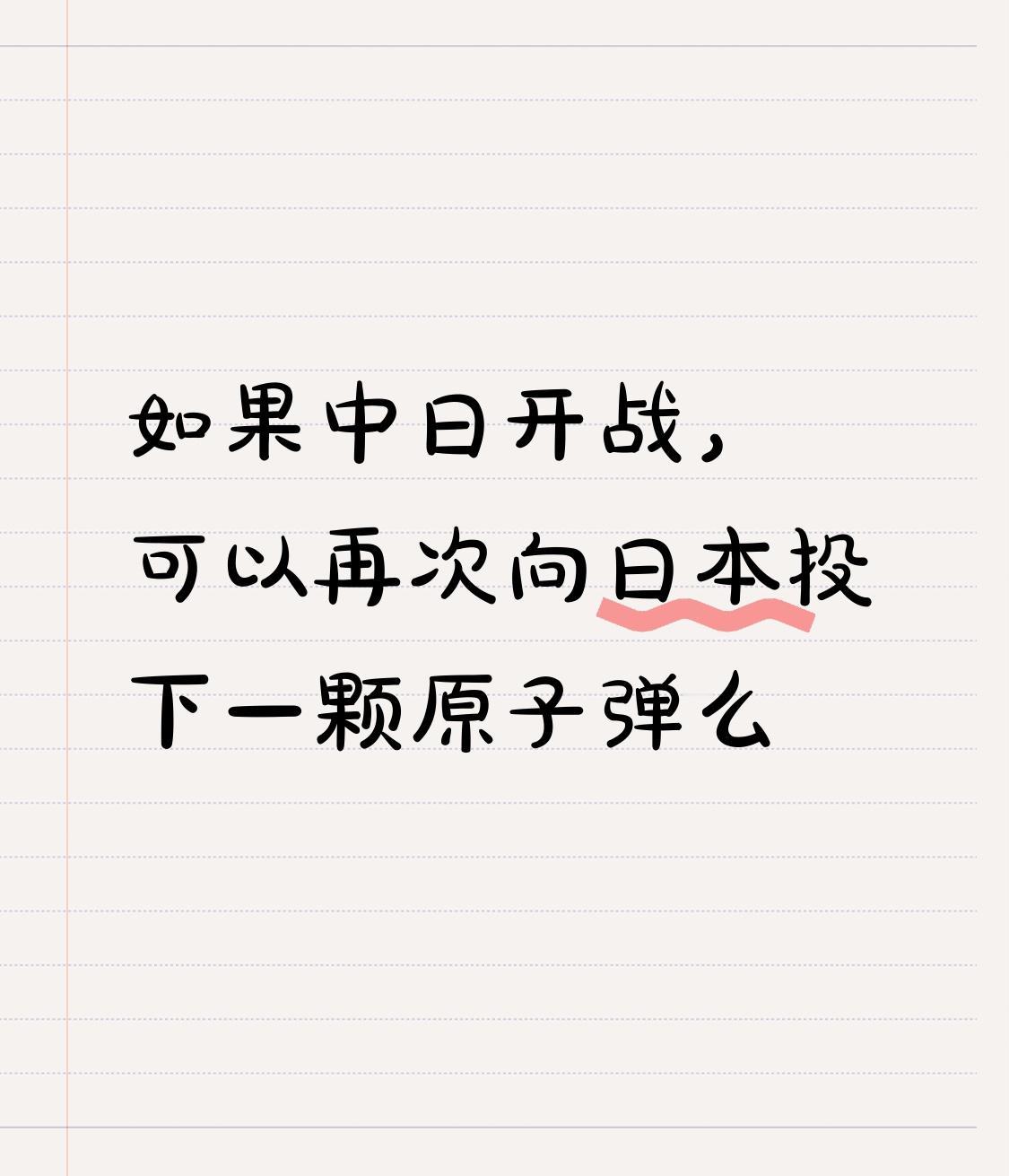 如果中日开战,投原子弹这事儿可不能简单拍板。从历史角度看,美国当年向日本广岛和长崎投下原子弹,造成了极其惨重的人员伤亡和长期的核辐射危害。这两颗原子弹直接导致约20万人死亡,无数人遭受病痛折磨。 如今国际形势不同,有《不扩散核武器条约》等一系列约束。贸然使用核武器会引发国际社会强烈谴责,可能还会让其他国家卷入,让局势更复杂。不过要是日本做出突破底线、严重威胁到我国核心利益的事,也不能排除极端手段。但最好的结果还是和平解决,避免生灵涂炭。 在考虑是否使用原子弹这种极端手段时,还得全面权衡军事与政治等多方面的影响。从军事层面来讲,使用原子弹可能会在短期内摧毁日本的关键军事设施和战略资源,迅速取得战场上的巨大优势。可它也会带来严重的附带伤害,比如核爆产生的冲击波、高温辐射等会对周边无辜民众造成难以估量的损失。 政治上,使用核武器会使我国在国际舆论场中陷入被动。尽管日本可能有挑衅行为,但国际社会很多国家更倾向于和平谈判解决争端,使用原子弹会破坏现有的国际秩序和外交平衡。 所以,在面对可能的中日冲突时,我们应先采取外交斡旋、经济制裁等手段,向日本表明我们的强硬立场。同时加强军事防御和威慑,展示我们捍卫国家主权和核心利益的决心。 其实多数人都希望和平,战争的残酷会让无数家庭破碎。无论何时,和平谈判都是解决争端的首选途径,只有在万不得已的情况下,才会考虑极端手段,毕竟维护和平、避免战争的灾难才是人类共同的愿望。