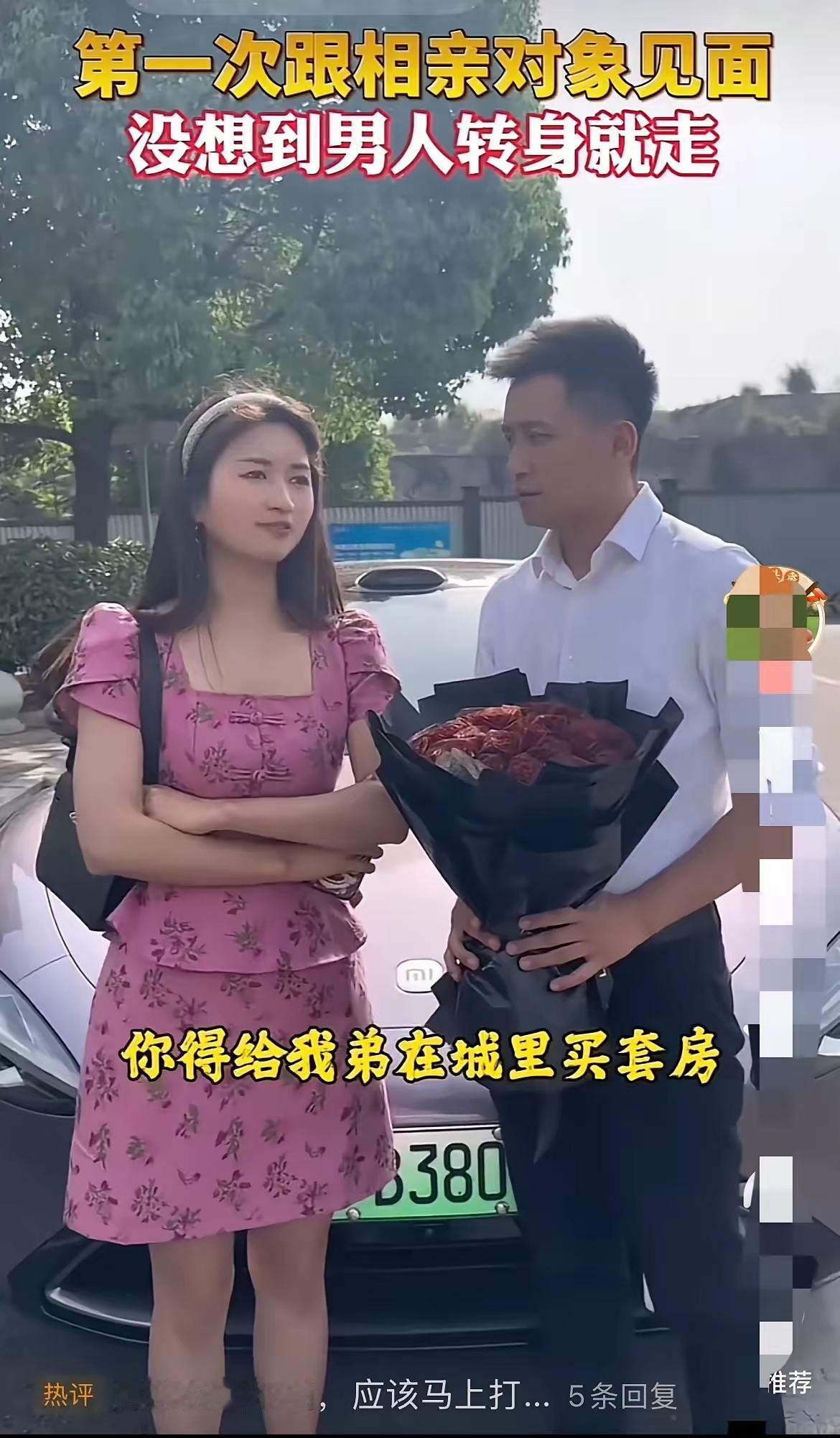 相亲刚开口提3个要求,男人直接转身就走 刚见面就给相亲对象下马威?这位姑娘的操作,直接把人给整跑了。 小伙手捧鲜花,站在自己的车前,本以为是浪漫开场。结果女生一开口就摆条件: “第一,这车不行;第二,你得给我弟在城里买套房……” 话还没说完,小伙当场脸黑,连花都没放下,转身就拉开车门走了。留下女生站在原地懵了:“我还没说完呢!” 评论区直接炸锅: “这哪是相亲,明明是来‘扶贫’的!” “还没确定关系,就开始惦记人家钱包了?” 现在的相亲市场里,“扶弟魔”式的要求早已成了雷区。姑娘可能觉得自己是在为未来争取保障,却忘了感情的基础是互相尊重,而不是单方面索取。 小伙的转身离开,其实是给所有拎不清的人上了一课: 婚姻不是扶贫,爱情更不是交易。 真正的缘分,从来不是靠提要求换来的,而是两个人愿意彼此奔赴的真心。 如果是你遇到这样的相亲对象,你会直接走吗? 相亲 分享你的婚恋观 女生相亲条件 女生相亲心理