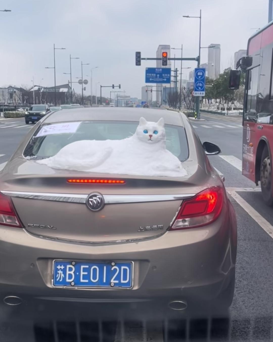 这猫好逼真,跟真的一样。 把雪人堆成一只猫,也是个有才的人。 这开着车在街上转一