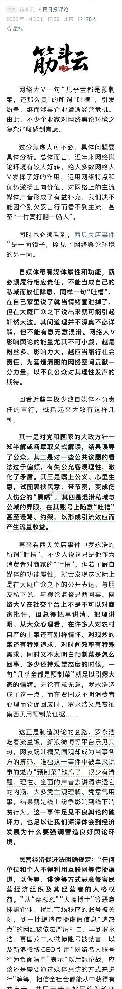 人民日报三评罗永浩、西贝事件:自媒体带有媒体属性和功能,就必须履行相应责任,不能当成自己的私域而放任肆意。用法律术语讲就是:有多大权利就要承担多大义务。好事正在发生,期待。热点观点律师说法