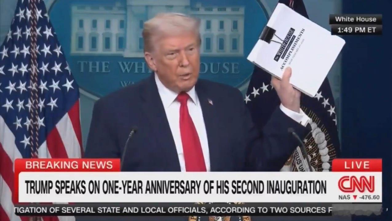 ‼️ 特朗普出来吹嘘他一年政绩 在纪念其总统任期周年的新闻发布会上,唐纳德·特朗普表示,这是不可思议的一年,他的政府取得了“前所未有的”成就。 “我可以站在这里读一整周——但我们仍然读不完,”特朗普谦虚地补充道,同时举起那厚厚的文件夹。特朗普重返白宫1周年金饰价涨到1495元 特朗普炫耀一年政绩时手指差点被夹