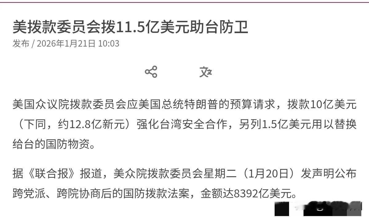 美国演都不演了!在美国军舰通过台海i之后,美国又在台湾问题上做文章了!美国拨款11.5亿美元,声称要强化与台湾的安全合作!1月21日,根据外媒报道,美国众议院拨款委员会应美国总统特朗普的预算请求,拨款10亿美元强化台湾安全合作,另列1.5亿美元用以替换给台湾的国防物资。 而这笔钱的主要用途包括帮助台湾,新购国防装备、服务,以及军事教育与训练。 评几句: 接连出手!美舰过台海后再砸11.5亿勾连台湾,台海局势风险加剧 美国众议院拨款委员会应相关预算请求,批准11.5亿美元用于强化与中国台湾地区的所谓“安全合作”,其中10亿美元专项支持相关合作事项,1.5亿美元用于替换台湾地区防务部门相关物资。这笔款项明确将用于台湾地区采购防务装备、相关服务及军事教育训练,而这一动作紧随美国军舰过航台海之后,显然是其持续在台海问题上操弄算计的又一体现。 从本质上看,美方此举绝非所谓的“维护区域安全”,而是将中国台湾地区当作借台湾问题牵制中国发展的棋子。同时,这也成为美国军工复合体攫取利益的渠道。美方打着“安全合作”的幌子加码对台军事支持,本质上是在虚化掏空一个中国原则,蓄意加剧台海地区的紧张局势。 一个中国原则是国际社会公认的准则,也是台海和平稳定的定海神针。台湾问题是中国的内政,任何外部势力都无权干涉。美方不断在台海问题上制造事端,持续推进对台军售和所谓军事合作,严重破坏中美关系政治基础,也将台海推向兵凶战危的险境。 针对美方与“台独”分裂势力的勾连行径,中国人民解放军始终保持高度戒备,常态化开展演训活动,坚定捍卫国家主权和领土完整。对于“台独”分裂势力与外部干涉势力的任何勾结挑衅,中方都必将采取坚决有力措施予以反制。如果“台独”势力执迷不悟,继续在分裂道路上越走越远,其注定只会落得身败名裂的下场。 一个中国原则不容任何挑战,中国终将统一,也必将统一,这是不可阻挡的历史大势。任何企图阻挠中国统一进程的势力,终将被历史和人民所唾弃。