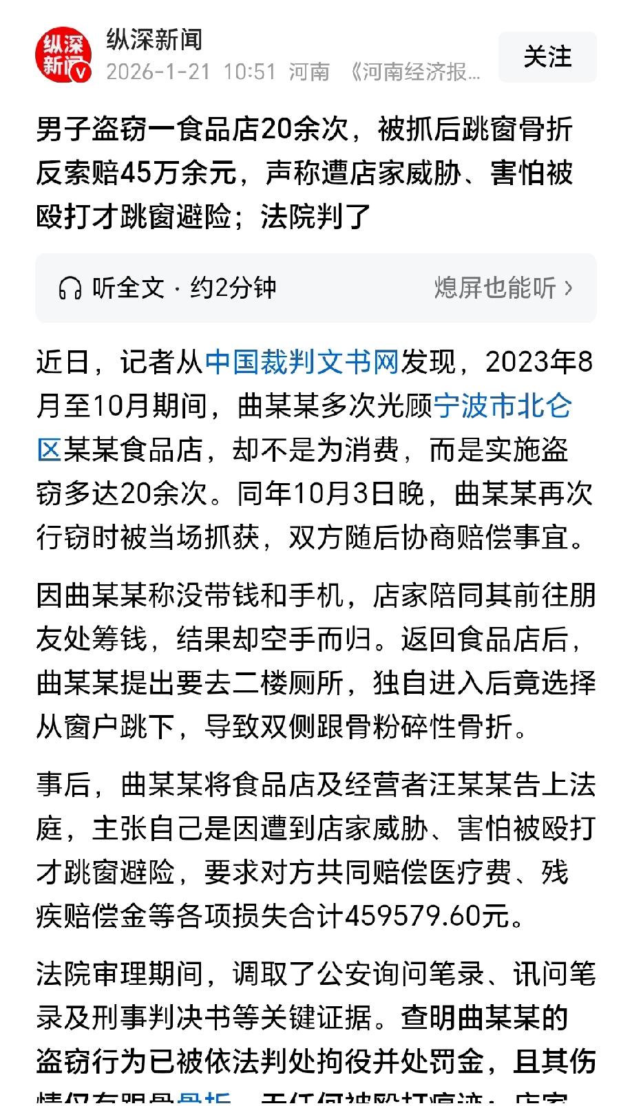 恶人先告状!浙江宁波,男子盗窃一家食品店20余次,终于被抓个正着,老板向男子索赔,男子实在拿不出钱,就借着上厕所的名义,趁老板疏于防备之际,从楼上窗户跳下,导致双腿粉碎性骨折。事后,男子却把老板告上法庭,索要近46万元的赔偿,理由是他遭到老板的威胁,害怕被老板殴打,这才不得已跳窗逃跑。法院的判决最后令人拍手称快! 据纵深新闻报道,2023年下半年,家住宁波的曲某某不知道犯了什么邪,盯上了一家普通的食品店,从8月到10月这俩月里,竟然偷偷摸摸去偷了20多次。 老板汪某某一开始还没太察觉,只觉得店里的东西好像总少点,但没抓到现行也没办法。 为了证实他的猜想,老板汪某某只能多留意店里的情况,试着抓到这个小偷。 果不其然,10月3号晚上,曲某某又一次伸手作案时,终于被汪老板当场抓了个正着。 被抓住的那一刻,曲某某心里别提多慌了,脸上一阵红一阵白,低着头不敢看汪老板。 汪老板实在气不过,自己开个小食品店本来就不容易,被这人反复惦记盗窃,损失可不少。 于是他直接跟曲某某说,这事儿不能就这么算了,得赔偿店里的损失。 曲某某哪有什么钱啊,偷东西本来就是因为手头紧,当下只能装可怜,说自己没带钱也没带手机,实在拿不出赔偿款。 汪老板看着他这副模样,也没多想,想着能拿到赔偿就行,总不能让他白偷这么多次。 于是,汪老板就陪着曲某某去他朋友那儿筹钱,结果跑了一趟,朋友也没愿意借钱给他,俩人只能空着手回到食品店。 回到店里后,曲某某心里越来越焦躁,他琢磨着,要是一直拿不出赔偿,汪老板会不会对自己动手? 越想越害怕,曲某某眼珠子一转,就跟汪老板说自己要去二楼上厕所。 汪老板也没多想,觉得他跑得了和尚跑不了庙,就让他自己上去了,也没跟着看管,毕竟店里还有生意要照看。 可谁也没想到,曲某某上了二楼之后,根本没心思上厕所,满脑子都是怎么逃跑。 他跑到窗户边,看了一眼楼下的高度,心里虽然有点打怵,但一想到赔不上钱可能要被殴打,就狠下心来,直接从窗户跳了下去。 “咚”的一声闷响,曲某某重重摔在地上,当场就疼得嗷嗷直叫,站都站不起来了。 汪老板听见声音赶紧跑出去一看,吓了一跳,赶紧报了警,还叫了救护车把曲某某送进了医院。 经过医生检查,曲某某双侧跟骨粉碎性骨折,伤得不轻,后续治疗花了不少钱。 本以为这事儿到这儿,曲某某该为自己的盗窃行为和冲动举动负责。 可让人万万没想到的是,他出院后竟然把汪老板和食品店告上了法庭,张口就要近46万元的赔偿款。 法庭上,曲某某声称,他之所以跳窗逃跑,是因为遭到了汪老板的威胁,害怕被汪老板殴打,出于避险才不得不跳窗,所以汪老板得为他的伤情负责。 这事一出,很多人不禁质问,盗窃者还有理了?汪老板更是又气又好笑,自己明明没打他也没威胁他,怎么就成了被告? 法院受理案件后,并没有只听曲某某的一面之词,而是调取了公安的询问笔录、讯问笔录,还有之前曲某某因盗窃被判处拘役并处罚金的刑事判决书等关键证据。 法院查明,曲某某的盗窃行为已经被依法追究刑事责任,而且他的伤情只有跟骨骨折,身上根本没有任何被殴打或者被威胁的痕迹。 更重要的是,汪老板自始至终都没有限制他的人身自由,在他去厕所时也没有跟随看管,根本不存在所谓的“威胁、殴打”情况。 《民法典》第一千一百六十五条第一款规定:行为人因过错侵害他人民事权益造成损害的,应当承担侵权责任。 本案中,汪老板仅要求曲某某赔偿盗窃损失、陪同筹钱、允许其上厕所,全程无威胁、无殴打、无非法限制人身自由,无任何过错行为。 曲某某跳窗骨折是其自主选择,与汪老板无因果关系。曲某某主张“遭威胁才跳窗”无证据支撑,汪老板不构成侵权,无需担责。 《民法典》第一千一百七十三条规定:被侵权人对同一损害的发生或者扩大有过错的,可以减轻侵权人的责任;损害是因受害人故意造成的,行为人不承担责任。 法院认为,曲某某作为完全民事行为能力人,明知二楼跳窗高度危险,仍为逃避赔偿故意跳窗,自身存在重大过错+故意。 其盗窃在先、跳窗在后,损害后果完全由自身行为导致,其提出的索赔理由,没有任何有效证据支撑,完全是无稽之谈。 最终,法院作出判决,驳回曲某某的全部诉讼请求,案件受理费也由曲某某承担。