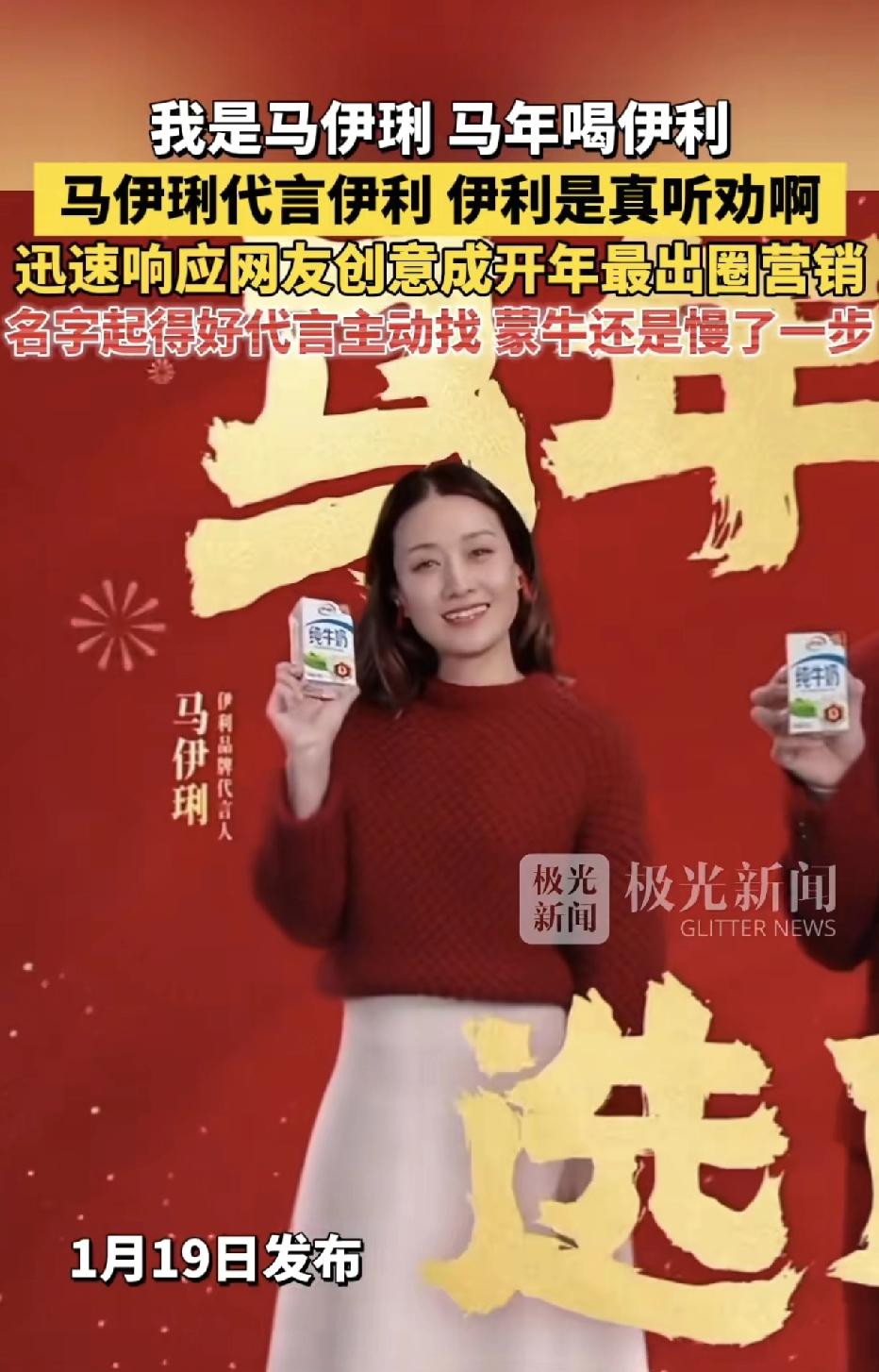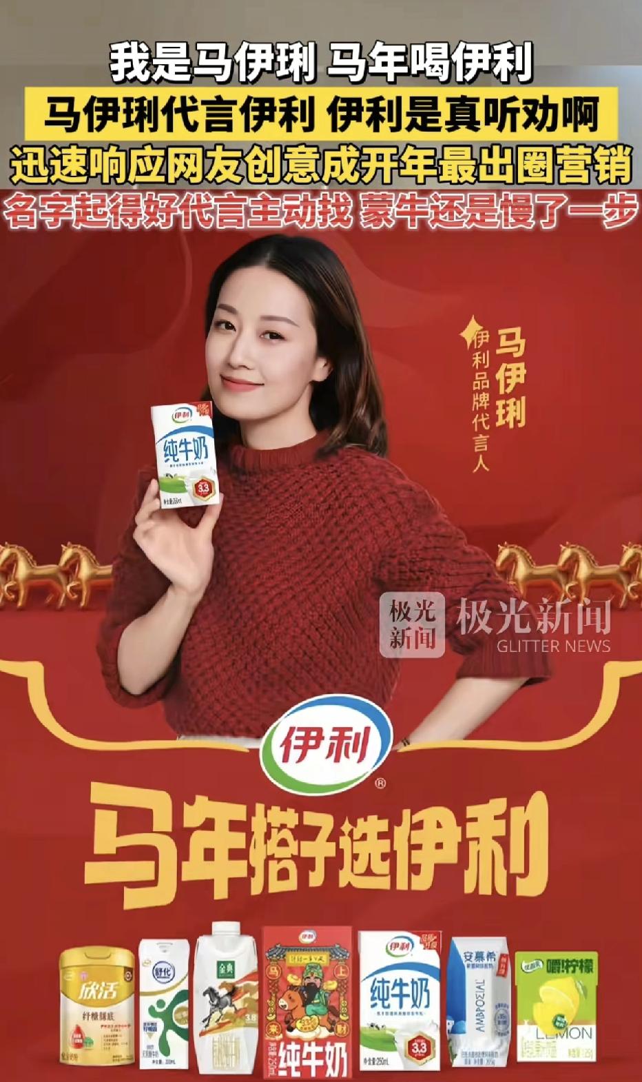 伊利是真的听劝,真的找了马伊琍代言,不久前网友向伊利提名了一位天选马年代言人——马伊琍,马伊琍的名字中既包含了马年的马字元素,又有跟伊利的品牌名发音相同伊琍二字,网友们连广告词都想好了,我是马伊琍,马年喝伊利。这波营销太会玩了,既带火品牌又有梗,必须支持。(图片来源于网络侵删)