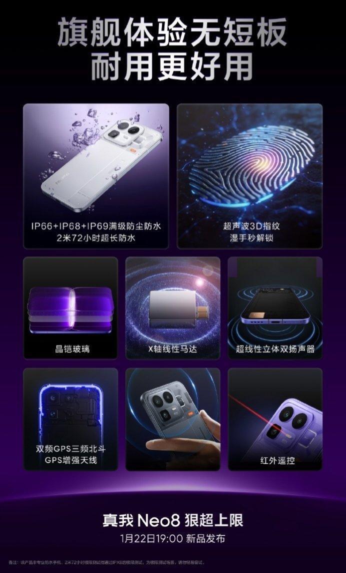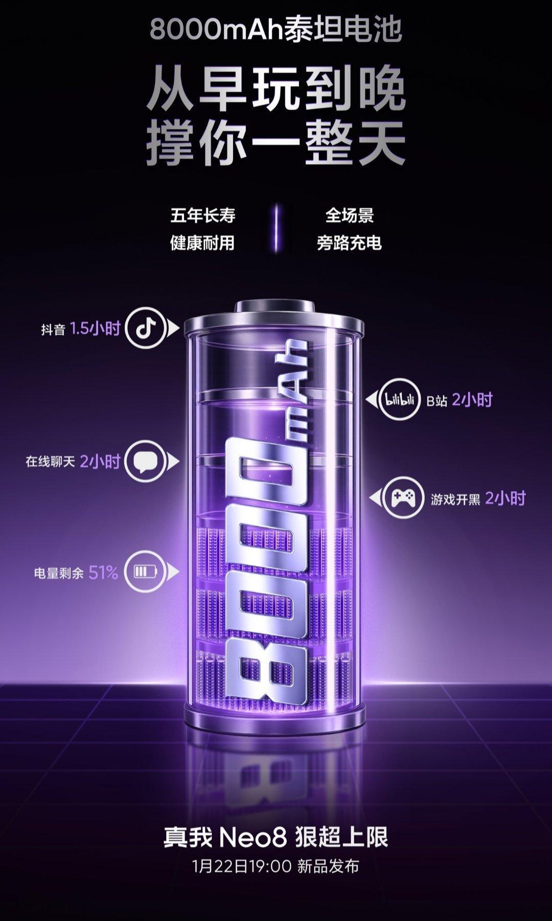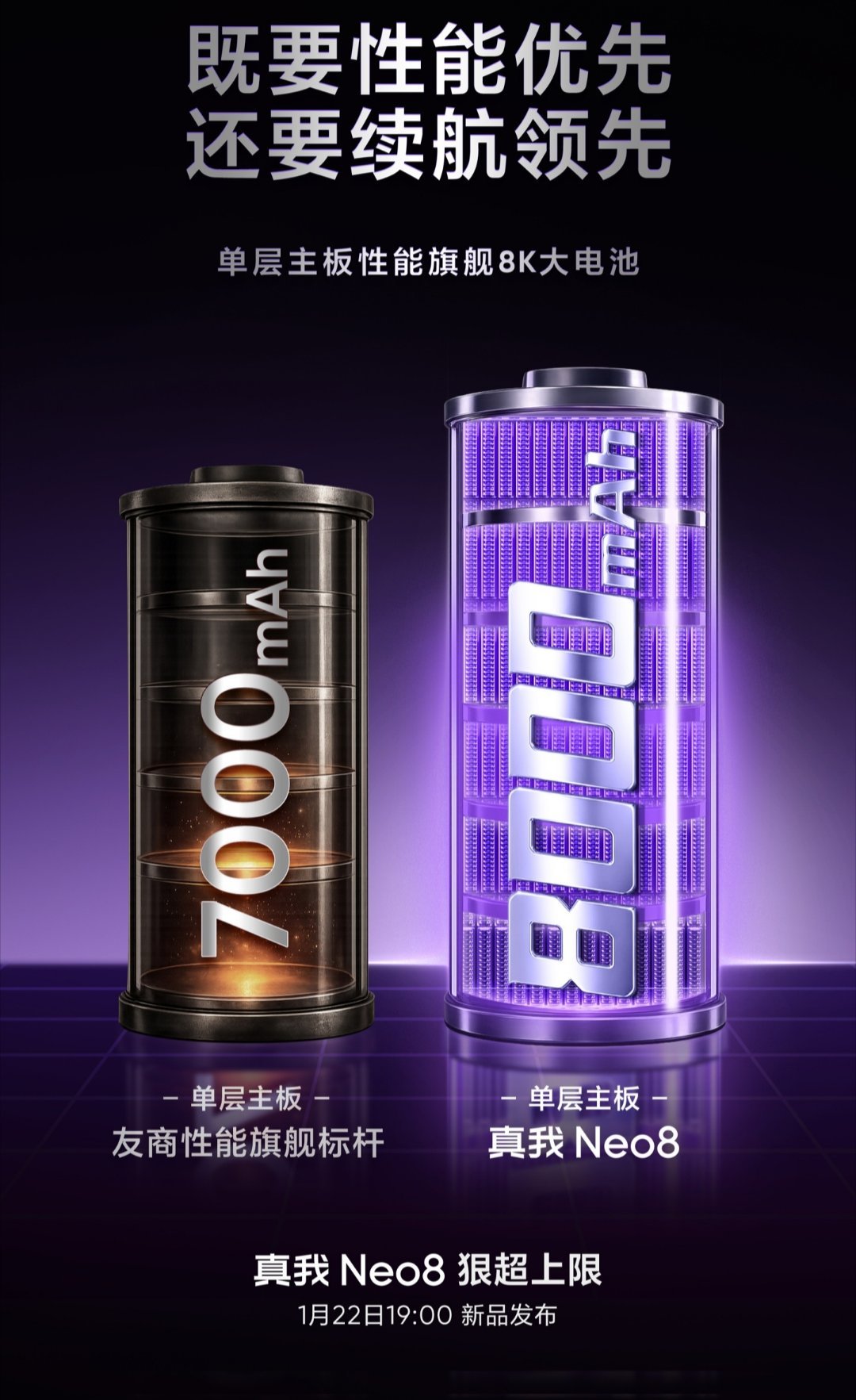 【realme 真我 Neo8 手机选择单层主板结构,官宣塞下 8000mAh 泰坦电池】真我 realme 徐起发文预热真我 Neo8。据介绍,新机选择单层主板结构,在此基础上还塞下了超大容量的 8000mAh 泰坦电池,比同样单层主板的性能旗舰标杆高出 1000mAh。据介绍,realme 真我 Neo8 手机这块 8000mAh 泰坦电池也是一块五年长寿电池,并支持全场景旁路充电。realme 真我 Neo 8 手机将于 1 月 22 日晚 19:00 正式发布,主要配置如下:第五代骁龙 8 x 极客性能面板:358W 跑分,首发自定义温控调节旗舰级超高速存储组合:LPDDR5X+UFS4.1大气流冷锋散热系统:39225mm² 散热总面积,2000W/m·K 散热系数,GT 性能引擎:先知能效调度、芯片级超帧渲染全球首发 165Hz 三星苍穹屏:M14 旗舰发光材料、全亮度 DC 调光、新一代妙感触控IP66+IP68+IP69 满级防尘防水超声波 3D 指纹晶铠玻璃X 轴线性马达超线性立体双扬声器双频 GPS 三频北斗 GPS 增强天线多角度 NFC红外遥控
