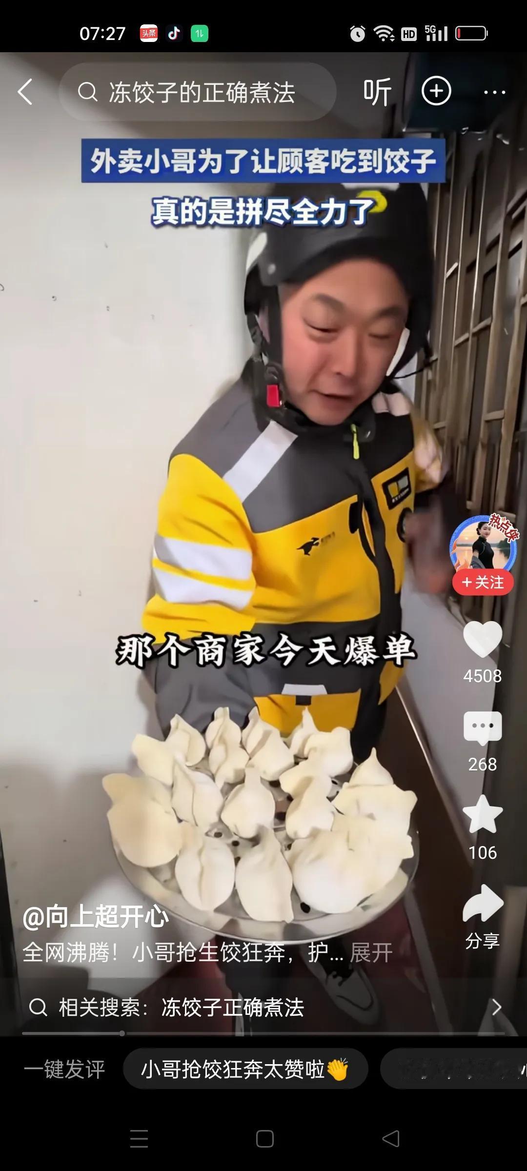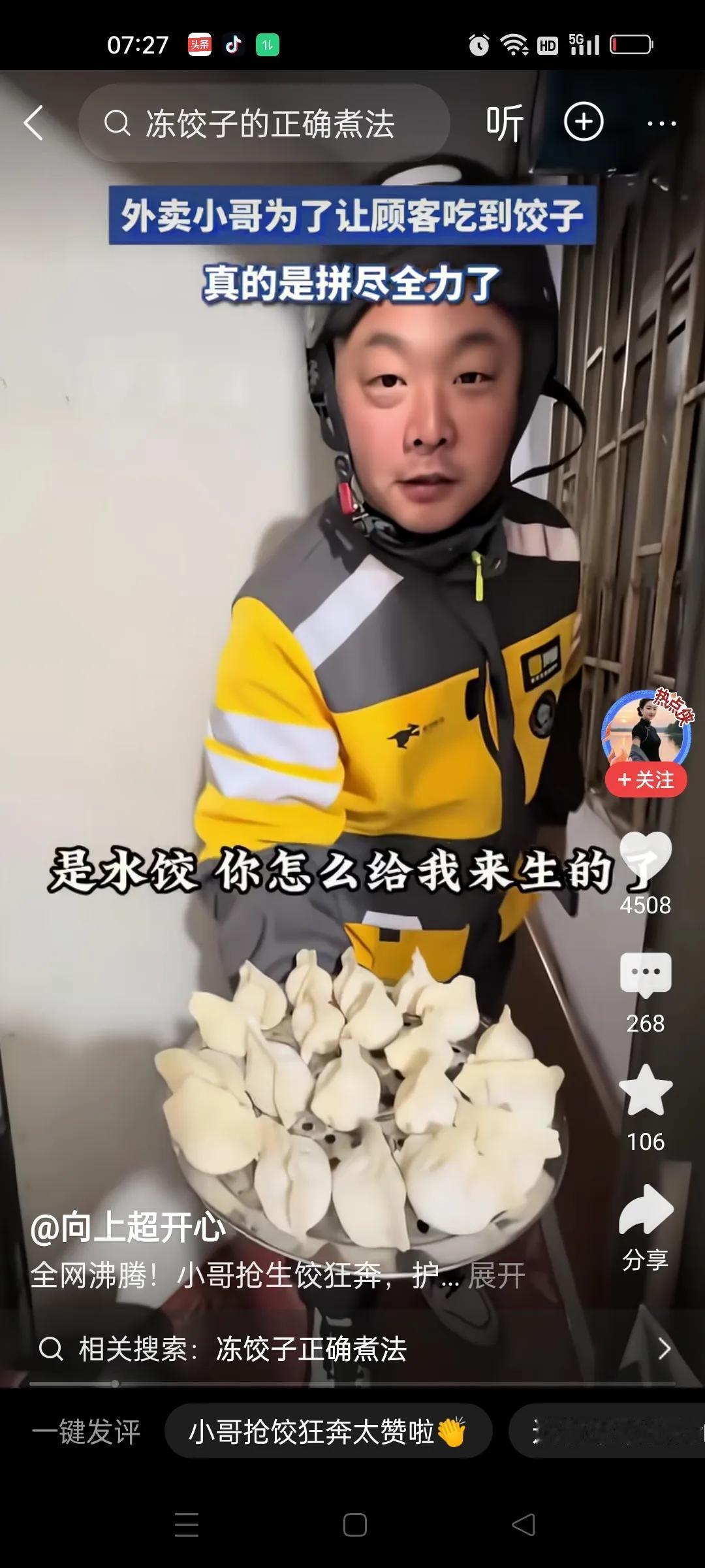 太意外!外卖小哥送来生饺子,背后故事直戳心窝! 想象一下,你满心欢喜地盼着热气腾腾的水饺外卖,好不容易外卖小哥到了,接过袋子打开的瞬间,整个人都懵了——送来的饺子居然是生的!这可不是电视剧里的搞笑桥段,而是真实发生在一客户身上的事儿。 客户又气又急,赶忙联系外卖小哥:“我点的是水饺,你怎么给我送来生的呀?”那语气里满是疑惑和不满。小哥在电话那头,声音里带着疲惫和无奈:“今天这订单像潮水一样涌来,客户爆单啦,厨房里乱成一锅粥,饺子根本煮不过来啊!” 原来,那天店里就像打仗一样。订单像雪花般纷纷扬扬地飘来,厨师在炉灶前忙得脚不沾地,额头上豆大的汗珠直往下滚;服务员在店里跑来跑去,一会儿端菜,一会儿接电话,忙得晕头转向;外卖小哥们更是急得像热锅上的蚂蚁,在店里不停地催促着,大家都为了能尽快把餐送到客户手中而“干仗”似的忙碌着。 这位外卖小哥眼看着自己负责的这份订单再不送出去就要超时了,要是超时,不仅客户会不满意,自己还可能被扣钱。他心急如焚,灵机一动,趁着厨房里大家都在忙得不可开交,没人注意的时候,偷偷从煮饺子的地方端了一盘已经包好但还没下锅的饺子,像一阵风似的就给客户送来了。 他气喘吁吁地站在客户面前,脸上带着歉意的笑容:“实在不好意思啊,不管啥馅的,您赶紧拿回去煮着吃吧,别饿着肚子。”客户看着小哥满头大汗、真诚的模样,心里的气一下子消了一大半,但还是有点疑惑地问:“那这蒸饺子的��帘子咋办呀?”小哥又爽朗地一笑,那笑容就像冬日里的暖阳:“簾子您就留着自己用吧,别跟我客气,就当是我送您的小礼物。”末了,还不忘调皮地补上一句:“别忘了给我一个五星好评哦