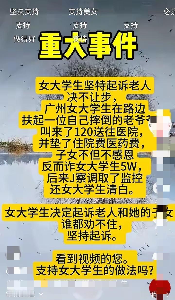 广州女大学生好心扶老人反被讹5万,这波操作真的寒透了心! 姑娘撞见老爷爷摔倒,二话不说上前扶起,还主动叫了120,自己掏钱垫付了医药费,满心想着做件好事,结果万万没想到,老人子女赶来后不仅半分感谢没有,反倒倒打一耙,张嘴就跟姑娘要5万块赔偿,硬说是她撞的人。 幸好现场有监控,清晰拍下全过程,直接还了姑娘清白,不然这冤屈真的没处说!本以为真相大白这事就翻篇了,谁料姑娘硬气到底,不管谁来劝都不听,铁了心要起诉老人和他的子女,讨回自己的公道。 这才是最该有的态度!好人的善心从来不是用来被拿捏的,一味退让只会让讹人者得寸进尺,只有让他们为自己的贪心和恶意付出代价,才能守住人心的温暖,不让以后想做好事的人望而却步。 善良要有锋芒,好心更要被善待,这波必须力挺姑娘!如果是你遇到这种事,会选择忍气吞声还是坚决维权?