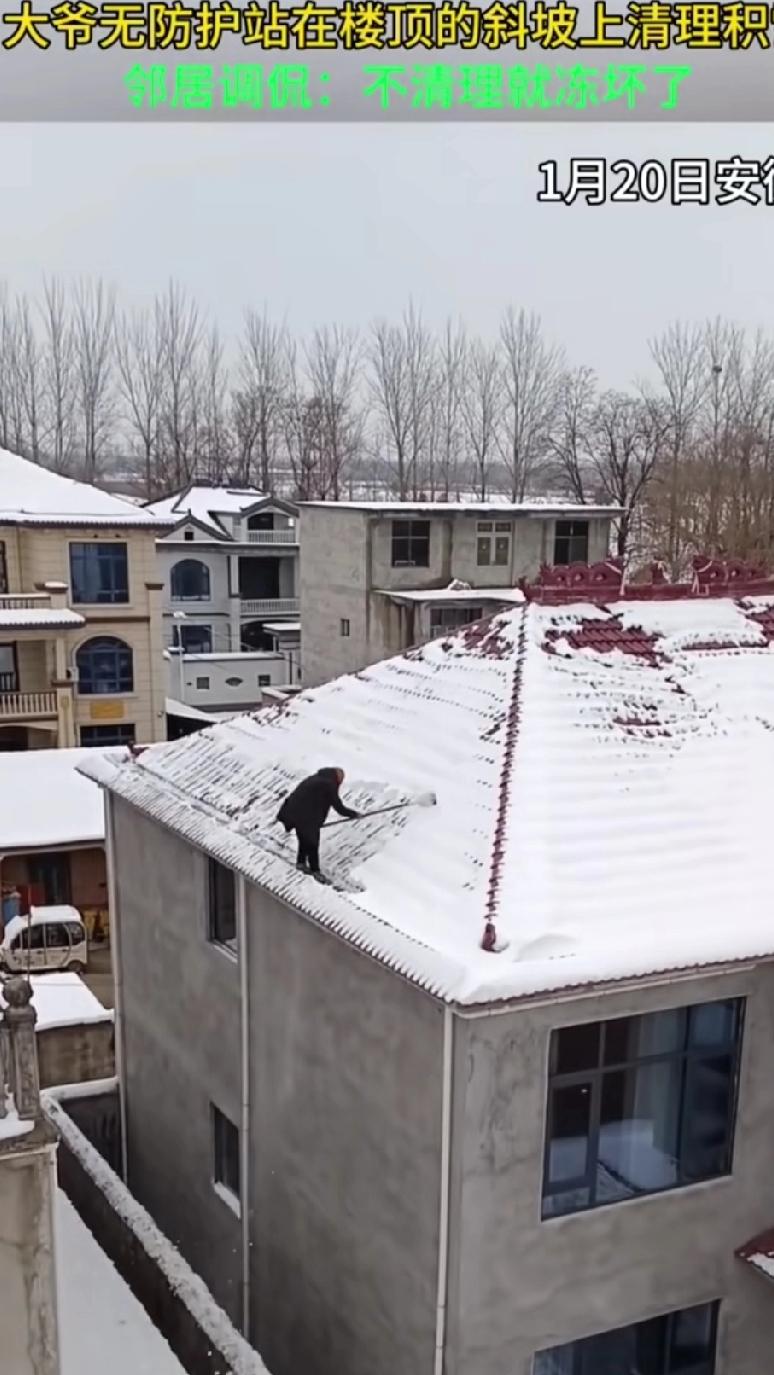 这活万一干不好,一失足成千古恨,悔之莫及! 安徽一大爷爬到二层小楼的楼顶上清理积雪,让人看了心惊胆战,担心大爷滑倒从上面摔下来,这可不是闹玩的事,楼顶这么高根本就不该去打扫,更何况是大爷,这活太危险了,又不是非干不可的活,奉劝大家尤其是生活在农村的朋友,雪后千万别去高处扫雪,以免造成意外!