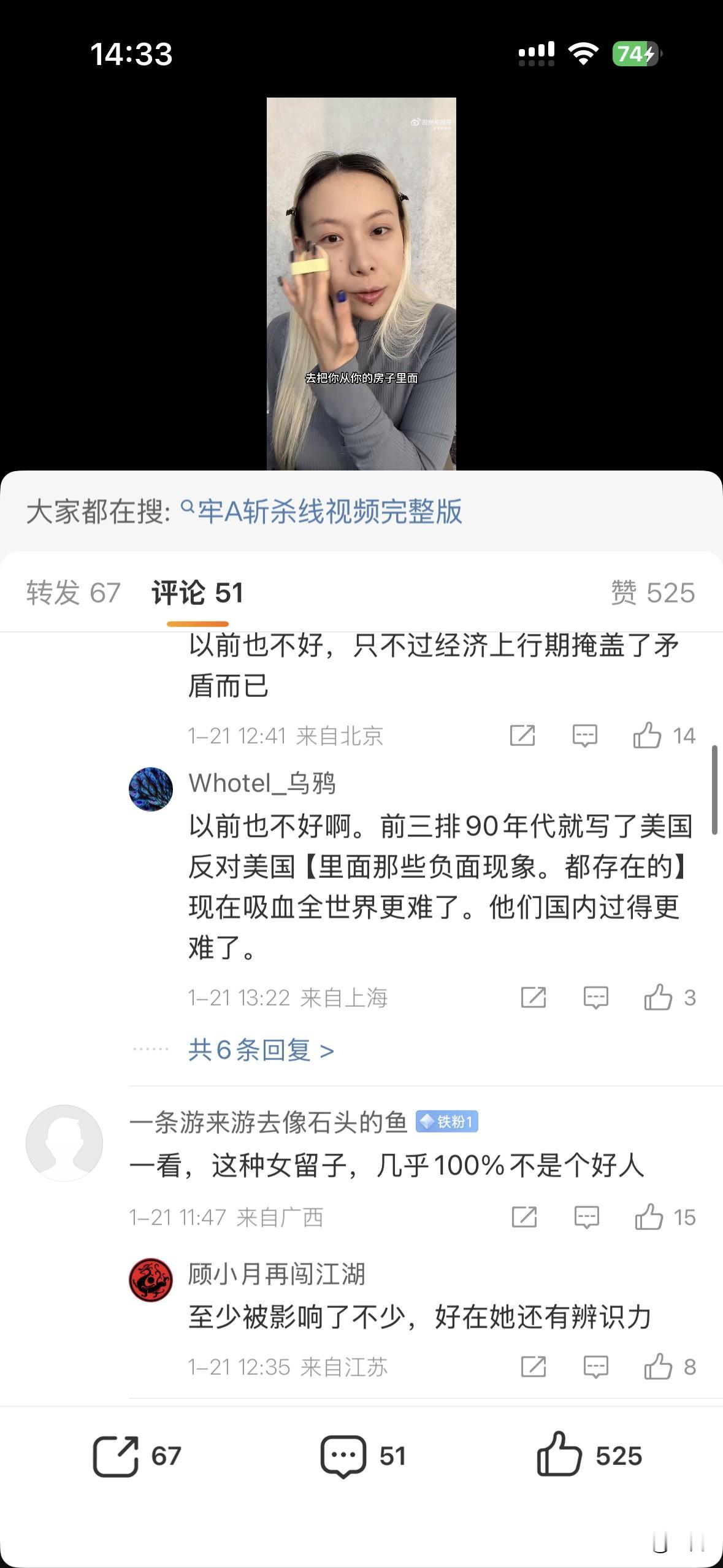 在美留学八年的妹子评斩杀线:“怎么会有一个词,把我在美国的经历和见闻形容得如此贴切??” 接着,妹子描述了自己在留学期间的种种骇人的见闻,省流就是:美国的社会机制就是一条巨大的层层叠叠的斩杀网,确保每一个人都被笼罩其中,无处可逃。即使拥有体面工作、受过良好教育的人,也随时可能被斩,沦为大街上的行尸走肉。 哈哈哈,好一个蹭流量的妹子[呲牙] 但是大家的关注点都放在她下巴的钉子上了。都问是穿孔还是贴上去的。 然后有人科普,说这是穿孔,欧美人喜欢这样的,亚裔女生很多都打或者被要求打…… 哎,这个妹子就算迷途知返要回归也很难啊!