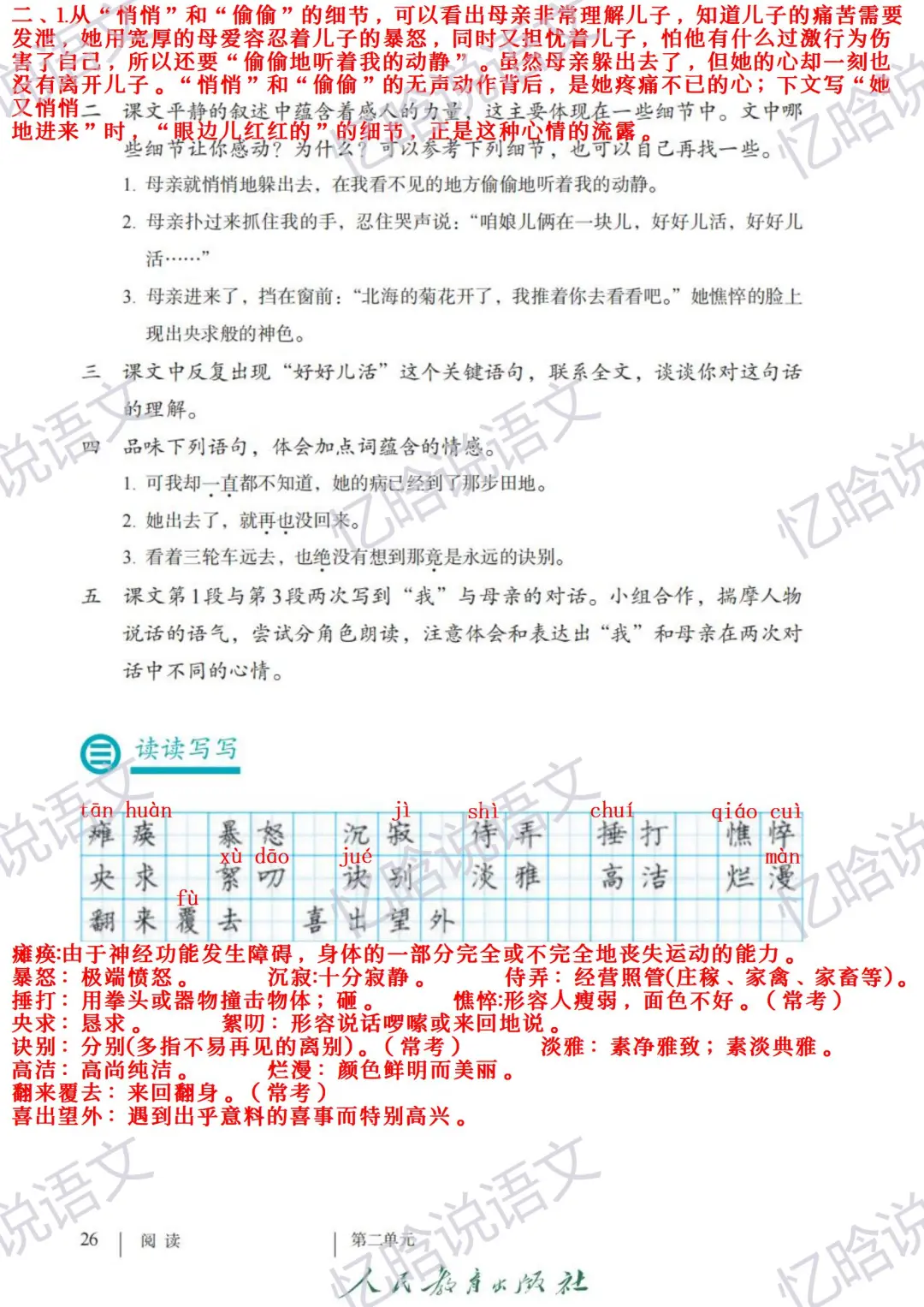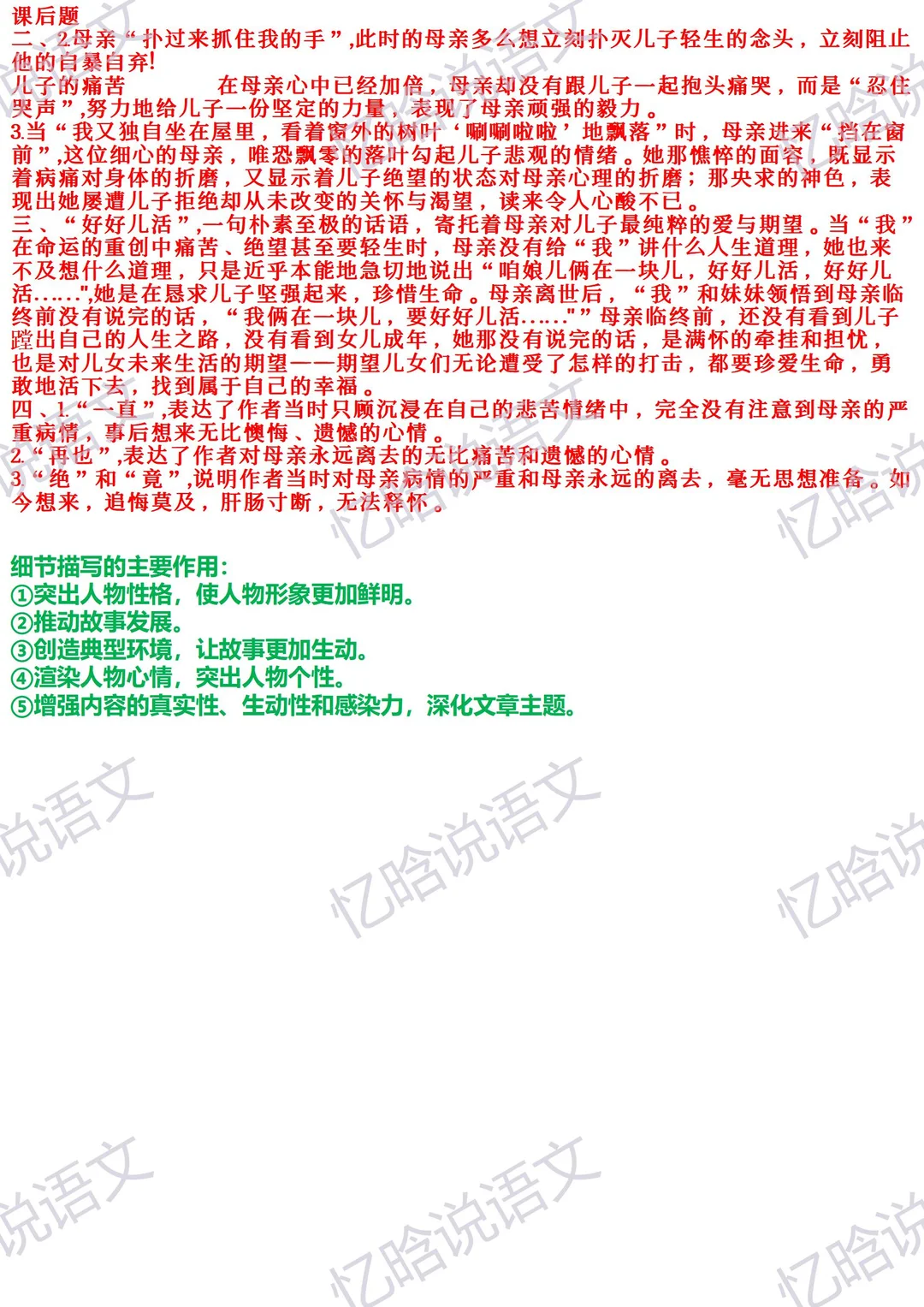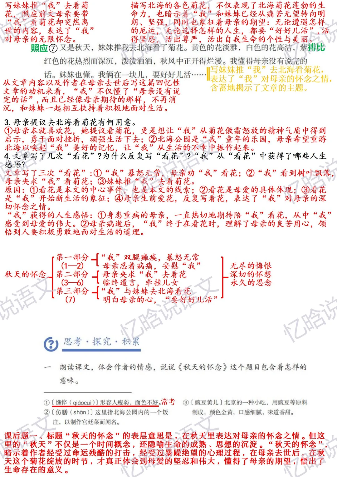 课文基础信息 作者:史铁生 文章结构:第一部分(1-2):主要写“我”双腿瘫痪后,目前忍受着病痛的折磨,对“我”百般抚慰。 第二部分(3-6):主要写母亲呵护“我”及母亲离世。 第三部分(7):写妹妹推“我”去北海赏菊花,表达了“我”对母亲的怀念和“我”决定“好好儿活”的信念。 文章主旨:这是一篇回忆性散文,表现了母亲对儿子的理解和关爱,讴歌了母爱的博大深沉、崇高无私,也表达了作者对母亲深切的爱与怀念。 2025全新升级课堂笔记,内容更详实,讲解更细致,点赞收藏关注我,带你一起学语文[飞吻R]