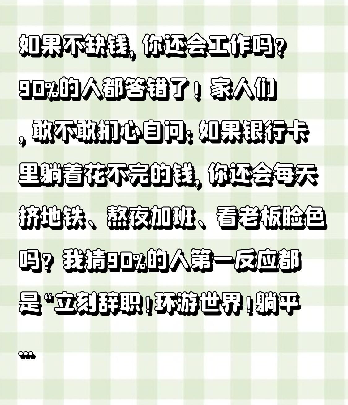 如果不缺钱,你还会工作吗?90%的人都答错了! 家人们,敢不敢扪心自问:如果银行卡里躺着花不完的钱,你还会每天挤地铁、熬夜加班、看老板脸色吗?我猜90%的人第一反应都是“立刻辞职!环游世界!躺平到老!” 可真的有人做到后,结局却出乎所有人意料! 前阵子同学聚会,当年嚷嚷着“赚够100万就退休”的老张,真的实现了财富自由。他靠投资赚了一大笔钱,40岁就辞了职,开始了梦寐以求的“躺平生活”。每天睡到自然醒,顿顿山珍海味,不是旅游就是打游戏,朋友圈晒的全是诗和远方。我们都羡慕得不行,说他活成了人生赢家。 转折点来了! 才过了半年,老张就憔悴了不少。他说,刚开始确实爽,可日子久了,每天浑浑噩噩,不知道自己该干嘛。想约朋友出来玩,大家都在上班;一个人待在家里,连个说话的人都没有。以前觉得工作是枷锁,现在才发现,工作带来的不只是工资,还有圈子、价值感和规律的生活。后来他闲不住,开了个小茶馆,不求赚钱,就图每天能和客人聊聊天,反而活得更充实了! 其实我们都搞错了一件事:工作的意义,从来不止是赚钱。它能让你每天有事可做,不至于和社会脱节;能让你在解决问题的过程中,找到成就感;能让你认识志同道合的朋友,拥有属于自己的社交圈。那些说“不缺钱就不工作”的人,大概率是还没尝过“无事可做”的空虚。 当然,我们不是鼓励大家当工作狂。而是想说,真正的理想生活,不是彻底躺平,而是做自己喜欢的事,顺便赚点钱。有人不缺钱,却跑去当志愿者,因为喜欢帮助别人;有人不差钱,却坚持开书店,因为热爱文字;有人财富自由,却还在做程序员,因为享受敲代码的乐趣。 说到底,钱能解决生存问题,却解决不了精神空虚。工作的本质,是让我们的人生更有意义。如果不缺钱,你最想做的工作是什么?是开一家小店,还是去环游世界顺便记录生活?评论区聊聊!点赞关注,下期分享普通人如何把爱好变成副业!