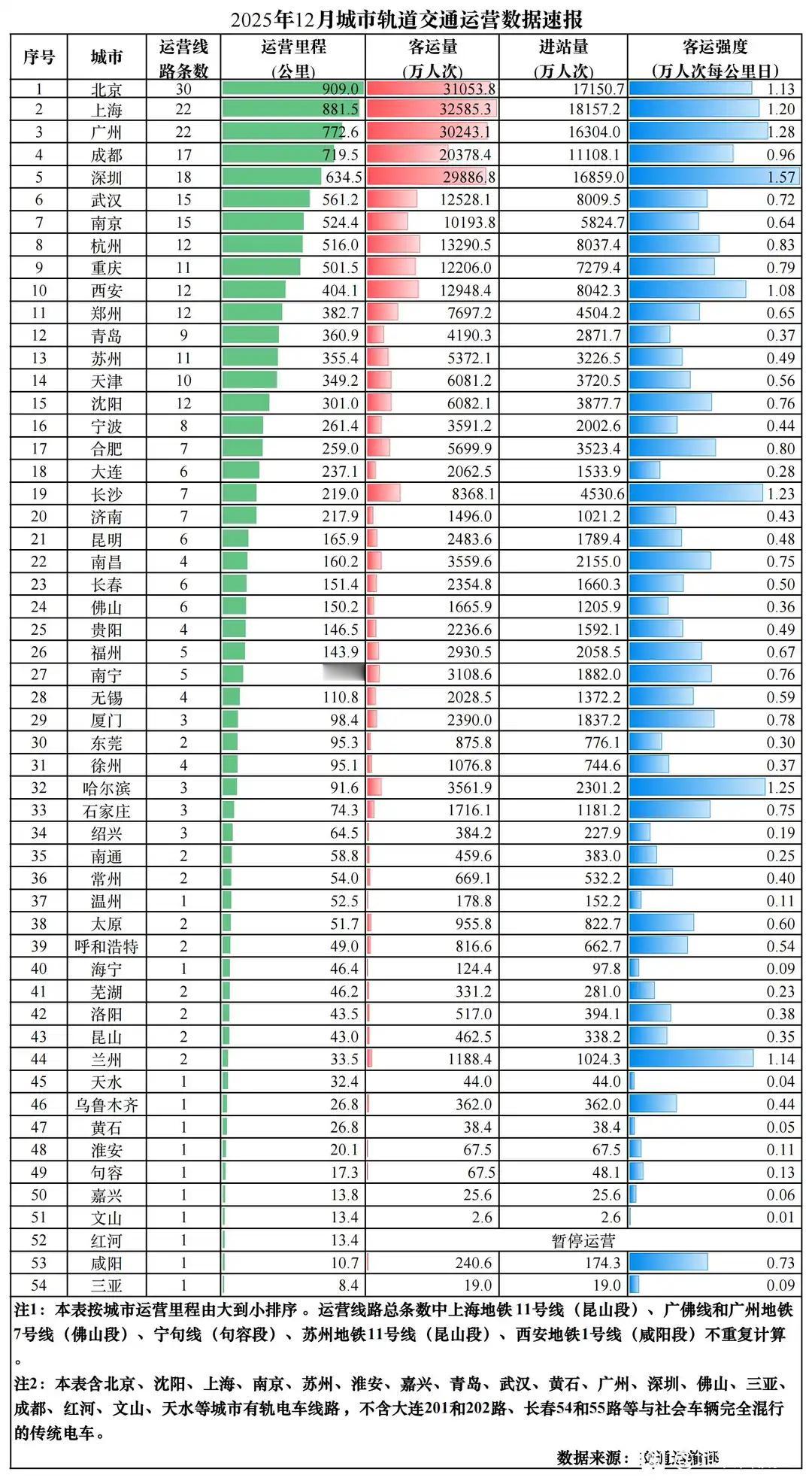 交运部数据出来了,2025年十二月份最后几天,济南新开的地铁直接把济南地铁客流强度拉了四五个点。 2025年11月份,济南地铁客流强度为0.39,到了12月份则是0.43了。 看来新开的地铁运力确实不错,短短几天就把济南地铁客流强度拉上了四五个点。 根据济南地铁这几天的表现来看,2026年1月份济南地铁客流强度应该在0.5-0.6之间。 主要是六号线只开通了东段,如果六号线全部开通,客流量突破0.7没有问题。0.7是国家允许下一轮地铁建设审批的最低要求。 如果七号线也投入使用的话,济南地铁客流强度应该能超过0.8。