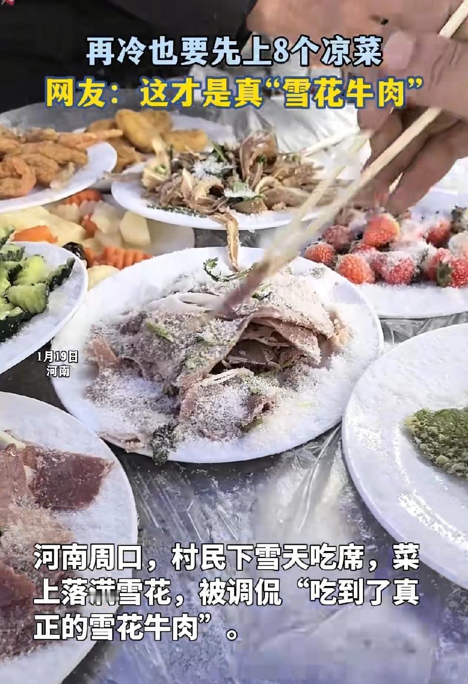 这心态绝了!河南周口,零下四五度的天气,一男子到村民家吃席,结果本来是户外场,又赶上当天下雪,菜上到桌子上是都已经是雪花了,可男子不但没嫌弃,看到雪花飘落在牛肉凉菜上,还调侃说是“正宗的雪花牛肉” 那天,村里一户人家办事,按照老规矩在自家院子里摆起了流水席。不巧赶上大雪,虽然主家赶紧搭了棚子,但雪花还是随着风往里飘。 菜一端上来,不多会儿就落上了一层白,尤其是先摆上桌的凉菜——拌黄瓜、牛肉、皮冻这些,眼看着就成了“冰雪版”。 当时温度降到零下四五度,可席上的气氛一点没冷。据吃席的宾客说,大家谁也没埋怨,反而觉得挺有意思。 夹菜前,用手或筷子轻轻抖一抖菜上的雪花,照吃不误。大家都知道,这不过是“前奏”! 等后面热气腾腾的炖菜、浓汤一端上来,几口下肚,身子暖了,话匣子开了,场面只会更热闹。在这风雪天里,人与人挨得更近,心也更热乎。 正如网友说的“一边抖雪一边吃,看着冷,其实心里暖得很!” 实话,现在生活好了,很多人办酒席追求酒店、讲究排场,可那种“风吹雨打都不散”的热乎劲儿,反而少了。 为什么这场“雪中宴”这么打动人? 因为它太真实了。生活本就不会事事如意,天气说变就变,但人心可以不变——你体谅我的不易,我珍惜你的情分。 帐篷不够挡雪,可人情够厚;菜凉得快,但心是热的。 而河南这场雪中宴,环境是“简陋”的,甚至带着不便,但情分是实打实的、热腾腾的日子哪有那么多万事俱备,但情义到了,风雪不过是助兴的背景。 大家在乎的不是吃得多么精致,而是“你来我往”的这份心。这种不矫情、不抱怨,一起扛点小风小雨的劲儿,特别让人感动。 生活从来不是精心布置的样板房,而是时有风雨的露天院。与其抱怨“雪怎么下这么大”,不如笑一句“尝尝雪花牛肉”。 这份随遇而安的豁达,比任何山珍海味都珍贵。日子要过,席也要吃。雪会化,情分会留下。