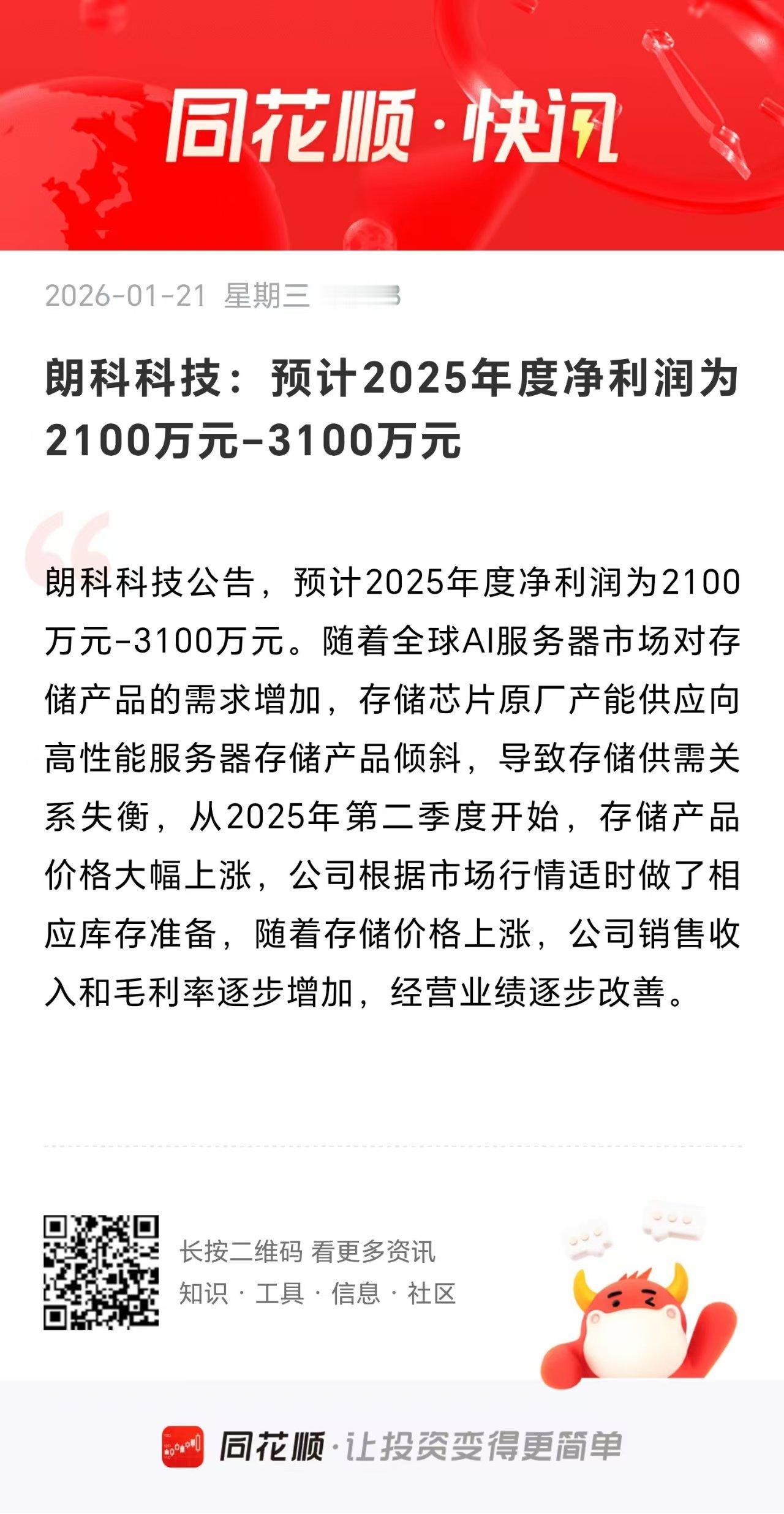 明天存储板块高开是大概率了? 刚刚存储代表公司康科科技发布了2025年的业绩预告,可以说好看的不得了。 内容显示,预计公司2025年度净利润为2100万元-3100万元,同比增长121%-131%, 为什么说相当亮眼? 细节就体现在第四季度!第四季度扣非净利润直接飙升到了5114万-6214万,同比大幅增长1075%-1285%! 大家看朗科这个第四季度业绩,是不是相当“好看”?用炸裂形容也不为过吧? 第四季度直接净利润增长了超10倍! 要知道朗科前三个季度都是亏损的,第四季度不仅是扭亏,而且是大赚。 这样的业绩无疑凸显了当前整个存储行业严重的卖方市场行情。 随着AI数据中心的不断推进,存储这一块2026年还得非常紧凑! 朗科的这份业绩,有望为明天整个存储板块的长虹创造激情昂扬的情绪背景!