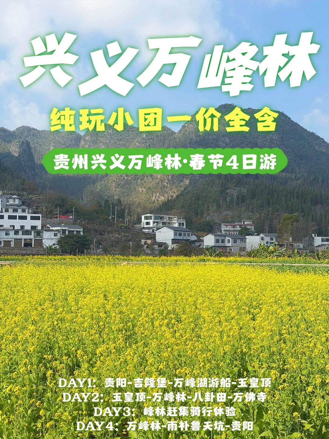 今年贵州的春天来得格外早!万峰林50%油菜花已盛开,金黄花海与喀斯特峰林相映成趣,预计春节期间全面爆花!👨👩👧👦家庭出游正当时,带娃在花田里奔跑、捉鱼、骑行,解锁春节最治愈的亲子时光~今天就带大家用4天深度游兴义!