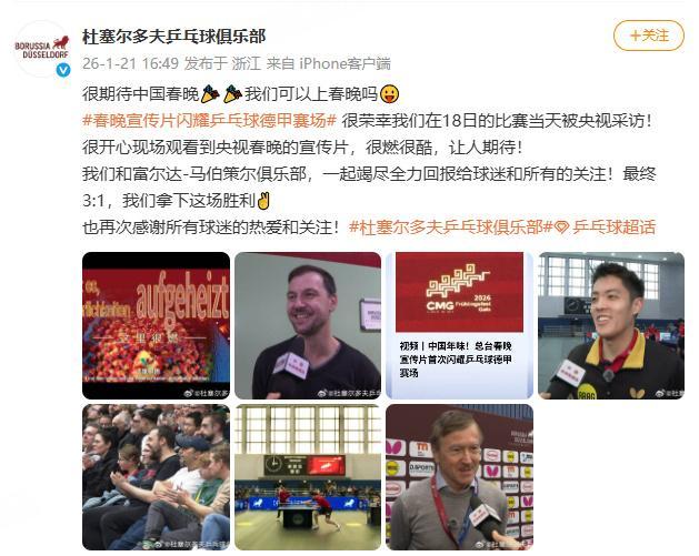 春晚宣传片首次闪耀德甲赛场波尔希望在中国亲身感受春节氛围 2026年中央广播电视总台春节联欢晚会宣传片首次亮相德国乒乓球甲级联赛赛场,在德国首都柏林引发广泛关注。在德国乒乓球甲级联赛杜塞尔多夫俱乐部对阵富尔达-马伯策尔俱乐部的比赛中,央视春晚宣传片在场馆内循环播放。喜庆祥和的画面、浓郁的年味吸引了众多球迷驻足观看。这是总台春晚宣传片首次走进德国乒乓球甲级联赛赛场。德国乒乓球名将波尔也来到现场为老东家杜塞尔多夫俱乐部助阵。他表示,春节是中国人一年中最重要的节日,“所有家庭都会团聚在一起,享受美好时光。我希望有一天也能和中国朋友一起在中国亲身感受春节的氛围,那是我最大的梦想。”官方也在微博发文写道:很荣幸我们在18日的比赛当天被央视采访!很开心现场观看到央视春晚的宣传片,很燃很酷,让人期待!
