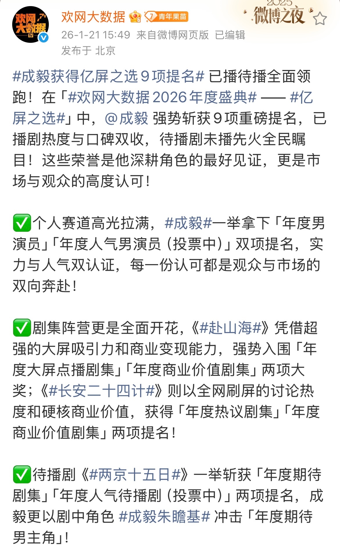 成毅入围欢网2026盛典9项提名成毅在2026年欢网大数据年度盛典“亿屏之选”中获得9项提名🎉包含(年度男演员、年度人气男演员、年度大屏点播剧集、年度热议剧集、年度商业价值剧集、年度期待剧集、年度人气待播剧、年度期待男主角)此次提名体现了成毅作品在热度、口碑与商业价值上的高度认可🔥成毅入围9项提名