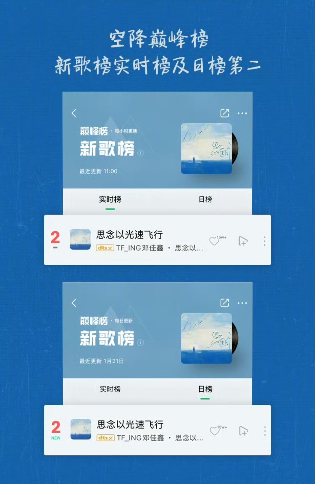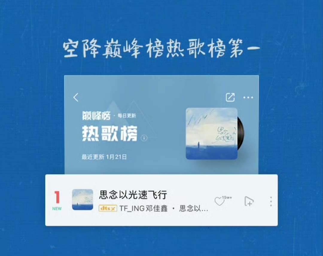邓佳鑫新歌战报邓佳鑫《思念以光速飞行》新歌战报💥1分18秒评论破999+ 3小时45分破1000000+空降巅峰榜热歌榜+音乐指数榜+评论人气榜+巅峰潮流榜第一邓佳鑫新歌思念以光速飞行战报