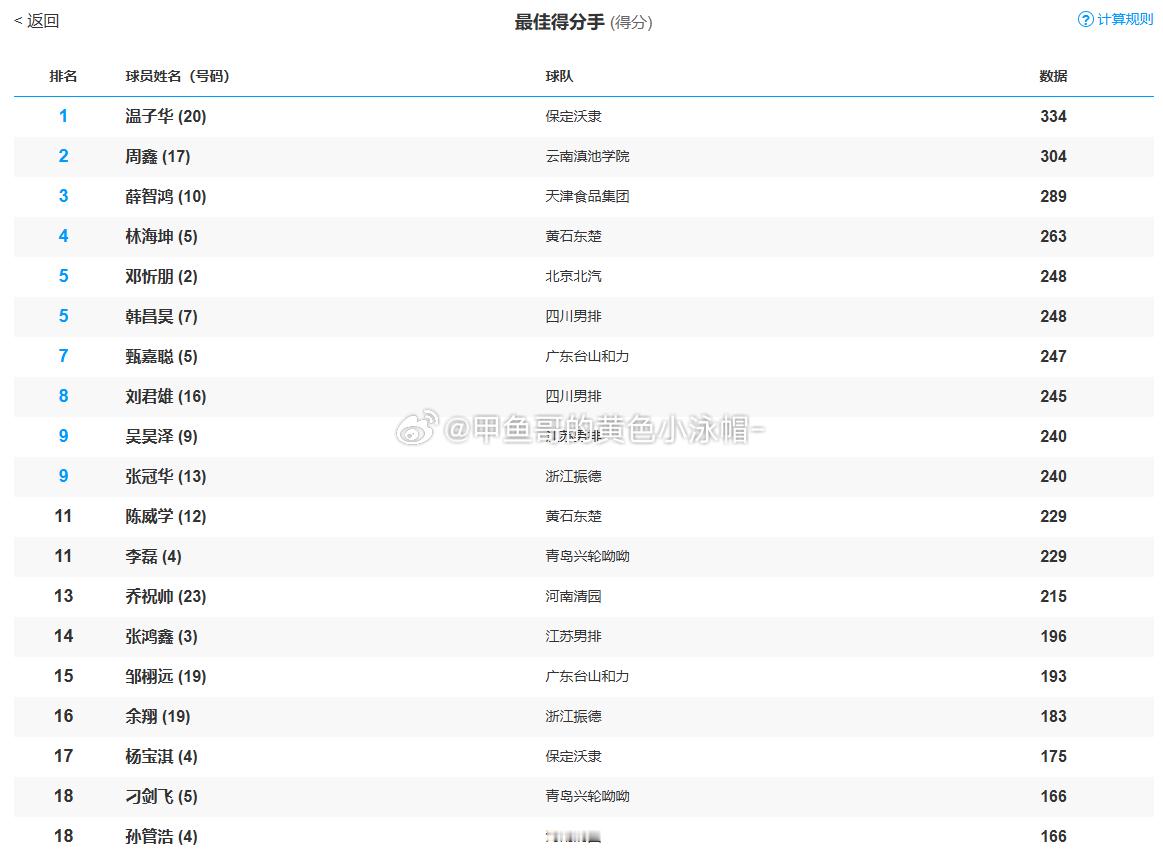 2025-2026中国男排超级联赛 截止第十轮,男排联赛得分榜排名:1. 温子华334分2. 周鑫304分3. 薛智鸿289分4. 林海坤263分5. 邓忻朋248分5. 韩昌浩248分7. 甄嘉聪247分8. 刘君雄245分9. 吴昊泽240分9. 张冠华240分