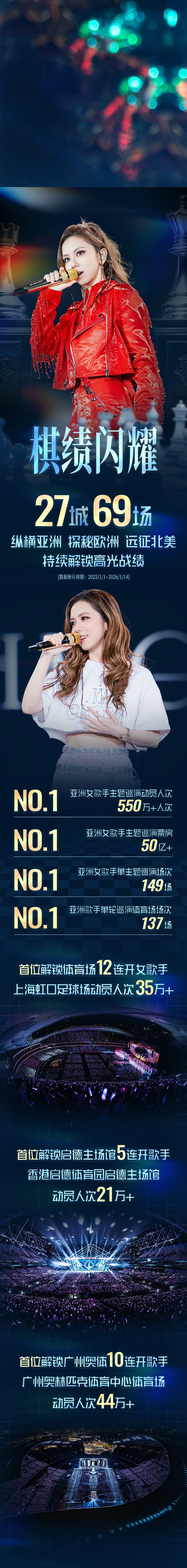 邓紫棋MVP结算画面 邓紫棋用2025年巡演,完美诠释了“亚洲顶流”的定义。动员、票房、场次均创女歌手纪录,上海、香港、广州三地不断刷新标杆。台前是光芒万丈的歌手,幕后是掌控全局的导演、编剧,她的才华与能量令人惊叹。