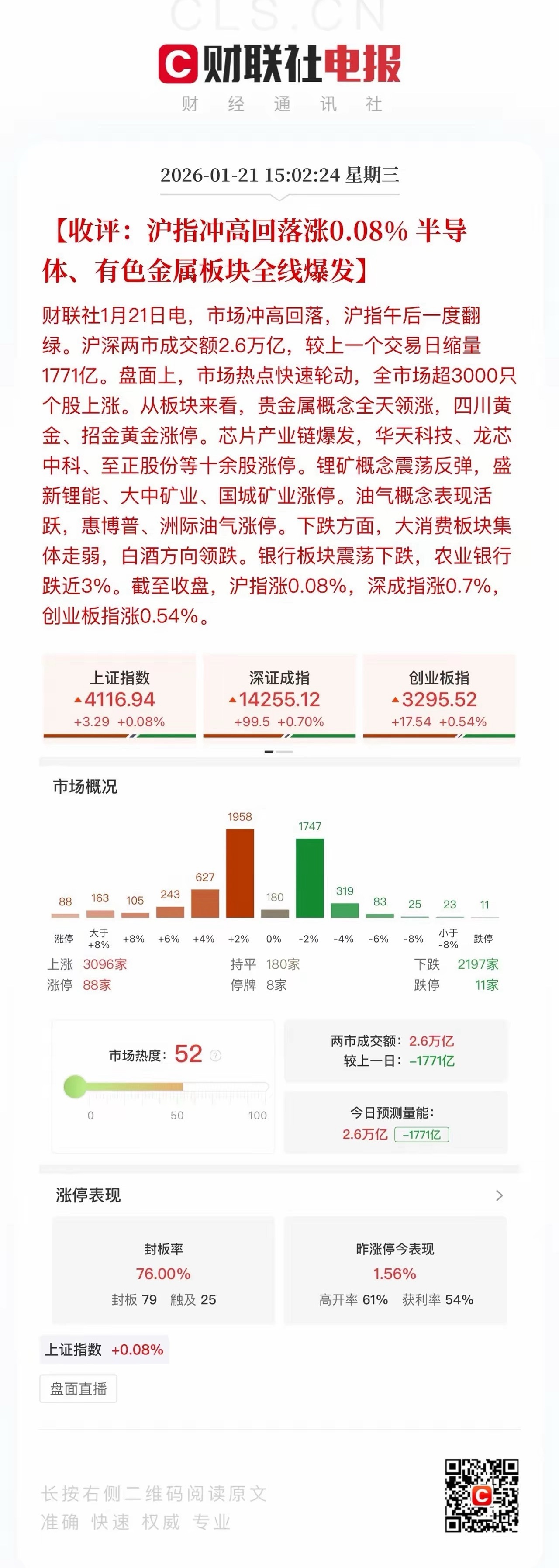 收评,市场回归正常!沪深两市全天成交2.6万亿,指数调整、板块轮动,主线赚钱效应飞起!存储芯片方向创新高一片片,百维存储、澜起科技、聚辰股份全部完成任务,小钱钱装口袋删自选。…半导体最后一程封测在加速,通富微电、华工科技、长电科技,仍然是通富微电保持龙头本色!高端PCB层积板供不应求,资金挖掘兴森科技补涨方向,龙头是鼎泰高科,PCB扩产设备龙头大族数控创历史新高。科技股这一轮牛市是涨舒服了…据说优秀的投资者在科技上吃3倍涨幅算合格!…三千现在反而想把重心放在消费医药,化妆品龙头珀莱雅、爱美客,酱油板块中炬高新、千禾味业,医药医疗通策医疗、爱尔眼科等,Ai应用瞄准金山办公、影石创新和科大讯飞!…