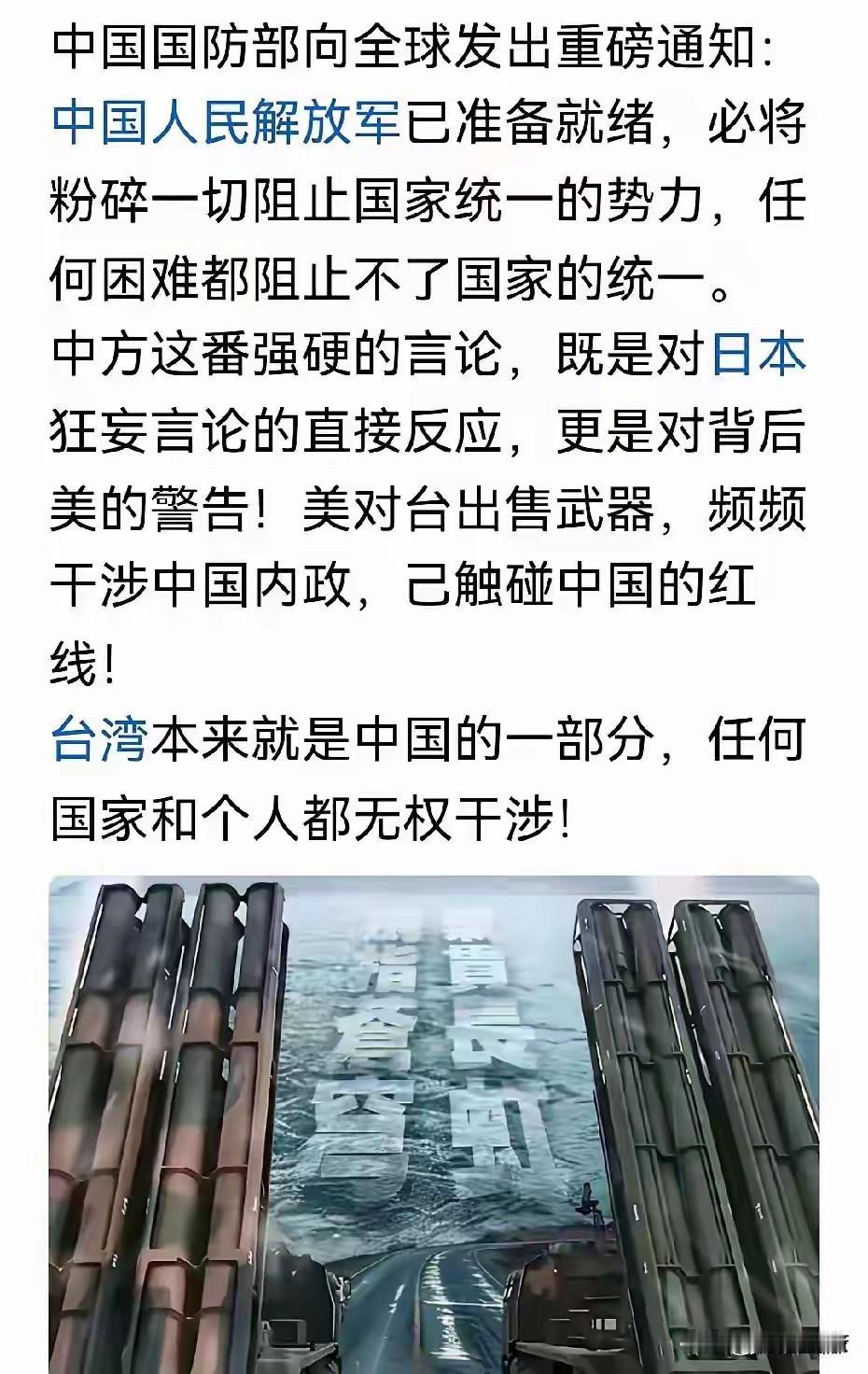 中国国防部硬核公告,中国人民解放军已经准备好了,有决心、有实力坚决捍卫祖国领土完整! 这是中国军方向全世界发出的誓言,任何国家胆敢侵犯中国的核心利益,都必将付出代价。 这是对小日本的严重警告,胆敢对中国台湾有什么坏心思,趁早打消念头,否则中国人民解放军将迎头痛击。 主权不容侵犯,统一势不可挡,任何外部势力都无权干涉中国的内政,如果胆敢挺而走险,必将遭到中国人民解放军迎头痛击。 中国不若事,也不怕事,胆敢挑战中国核心利益的图谋,必将遭到彻底粉碎! 犯我中华者,虽远必诛!如今,国际形势风云变幻,总有一些别有用心的势力妄图在台湾问题上大做文章。日本作为曾经给中国人民带来沉重灾难的国家,更应深刻反思历史,谨言慎行。 近年来,日本部分政客频繁在涉台问题上发表错误言论,甚至与“台独”分裂势力勾连互动,这种行径严重破坏地区和平稳定。他们似乎忘了,中国早已不是那个任人欺凌的旧中国,中国军队也早已今非昔比。 从现代化的战舰驰骋在辽阔海疆,到先进战机呼啸着掠过蓝天,从信息化的指挥系统高效运转,到英勇无畏的人民子弟兵枕戈待旦。中国人民解放军拥有着捍卫国家主权和领土完整的强大底气。 日本若一意孤行,在错误的道路上越走越远,那么等待他们的必将是中国军队的雷霆之击。我们有能力在第一时间做出反应,让任何侵犯者都为自己的鲁莽行为付出惨痛代价。 历史的车轮滚滚向前,实现祖国完全统一是全体中华儿女的共同愿望和坚定意志。任何试图阻挡这一历史大势的国家和势力,都将被无情碾碎。我们坚信,在中国人民解放军的钢铁守护下,祖国的领土必然完整,国家的尊严不容亵渎!