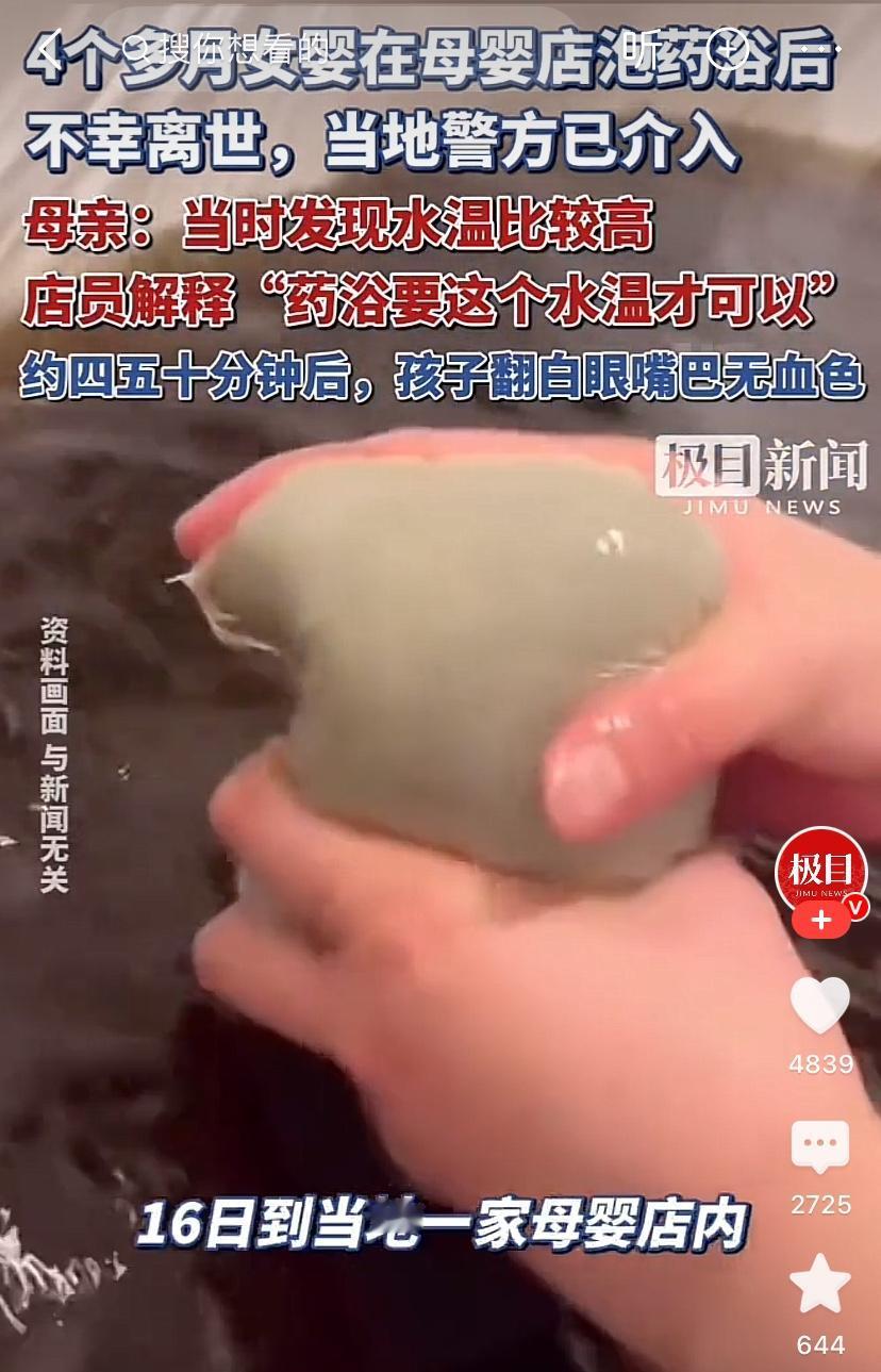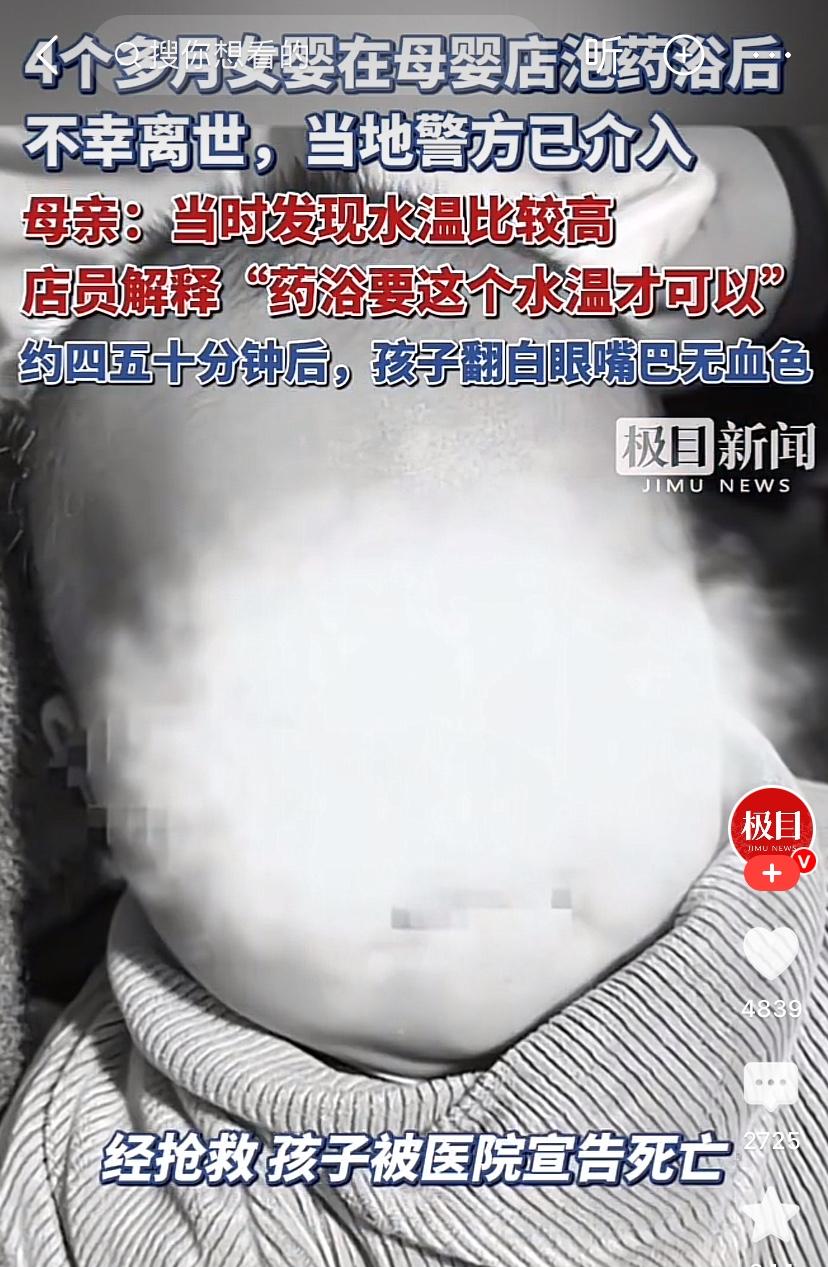 四个月的婴儿到母婴店泡药浴不幸死亡! 看到这个事件,我突然脊背发凉 我孩子四个月的时候发烧,带去母婴店泡澡,结果孩子就一直放声大哭,全身憋得通红! 我刚开始以为是他第一次游泳,有点害怕,就没有多管,以为他慢慢适应就好了,虽然非常心疼,还是没有去管他,就把他交给母婴店内的店员,等着他适应。 但是过了很久,孩子还是一直哭,而且感觉他很害怕。 我实在受不了了,就让店员把孩子抱出来,不用泡了,结果店员告诉我,孩子第一次游泳不习惯,慢慢习惯了就好了,还一直在数落我,孩子都那么大了,一次都没有带出去游泳,还说多带游泳有什么什么好处等等。 但是我看的孩子一直在哭就坚持抱孩子出来,自己伸手去抱,店员这才不情愿把孩子抱出来。 就在给孩子冲澡的时候,我碰了一下水,我差点打人! 给孩子冲澡的水温特别高,我一个大人碰到都会觉得烫,更何况是小孩子。关键是店员还一直说是正常水温,真的差一点气得打人。 从那以后我再也没有带孩子去泡过澡。 而且在那次之后,我的孩子在很长时间内一直都非常抗拒洗澡。 想想真的非常后怕,带孩子真的要谨慎,谨慎加谨慎,一点都不能马虎。 就像这次新闻里给孩子泡药浴的这个妈妈,她要是在发现水温很高的时候就把孩子抱出来,也许就可以避免这场悲剧!