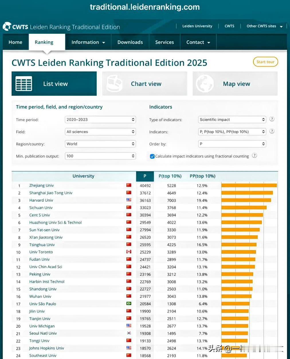 没有看错吧,中国两所大学位列2025最新世界大学排名前两名。 荷兰‌莱顿大学‌(Leiden University)下属的‌科学技术研究中心‌(CWTS)发布了2025年度最新莱顿大学所做的国际大学排名‌。 在最新发布的榜单中,中国高校因在科研产出总量上表现极为突出,整体排名特别靠前,表现特别亮眼。其中,浙江大学‌位列全球第一,‌上海交通大学‌排名第二,‌哈佛大学‌位列第三‌。在前十名中,共有‌8所中国高校‌,其余两所分别为加拿大多伦多大学和美国哈佛大学‌。 进入前十名的中国大学还有:四川大学、中南大学、华中科技大学、中山大学、西安交通大学和清华大学,分列第四、五、六、七、八和九。加拿大多伦多大学位列第十。 可能有人认为,对比国际上其他传统的大学排名,荷兰莱顿国际大学排名权威性不够。但莱顿国际大学排名摒弃了其他大学排名体系的很多非大学本身要求的因素,比如接受社会捐款数额、国际交流学生人数、毕业学生中的名人数量等等,而是以大学科研论文发布及产出为评价。 并且,莱顿国际大学排名不收费,不接受捐款,没有商业行为。因此,在评价大学考研产出方面绝对具有权威性。 这表明,世界大学实力呈现出一个明显的“东升西降”的趋势;美国大学不再是一家独大,中国高校的科研实力以惊人的速度在崛起。 这也让我们回归理性,重拾自信,对国外所谓的快乐教育有一个根本的全新的认知。所谓快乐教育不一定会好大学的。我们不要被别有用心的人带歪了节奏。 全球大学排行 全球高校排名