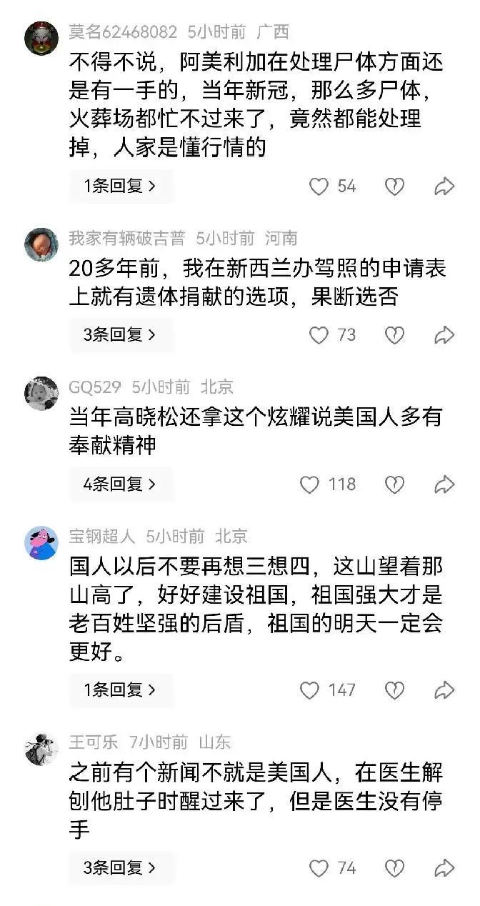 每天有17个人,在美国的器官等待名单上,无声无息地死去。 高晓松老师前段时间盛赞美国的器官捐献,说它自愿、透明,充满人性的光辉。 话,当然没错。 但有个叫“牢A”的网友,留下一条神评论,把我彻底点醒了。 他说:“捐完华尔街给你身体估个价,还能上纳斯达克。 ” 🦴💵 这句话,细思极恐。 我们看到的,是系统自愿登记的表象。 没看到的,是系统背后那套冰冷的资本逻辑。 最新数据,全美有超过10万人还在苦等一个救命的器官,队伍长得令人绝望。 而学术研究已经扒开了另一层皮:在这个“透明”的系统里,高收入患者获得移植的几率,显著高于穷人。 什么意思? 意思是,当你的生命进入倒计时,决定你生死的,除了医学配型,可能还有你的银行账户余额。 有钱人的名单,就是比穷人跑得快。 这哪里还是纯粹的医疗救助? 这分明是一场以生命为标的、经过精密包装的资本游戏。 自愿捐献的崇高初衷,在分配环节,就可能被悄无声息地异化。 高晓松看到了灯塔的光,但“牢A”们,看到了灯塔下长长的、明码标价的影子。 当生命权都能被估值、被上市,我们每个人在系统里,还算人吗? 还是说,迟早都只是一串待价而沽的“生物资产”? 评论区聊聊:你觉得高晓松是看得太浅,还是选择性失明? 他到底天真,还是坏?