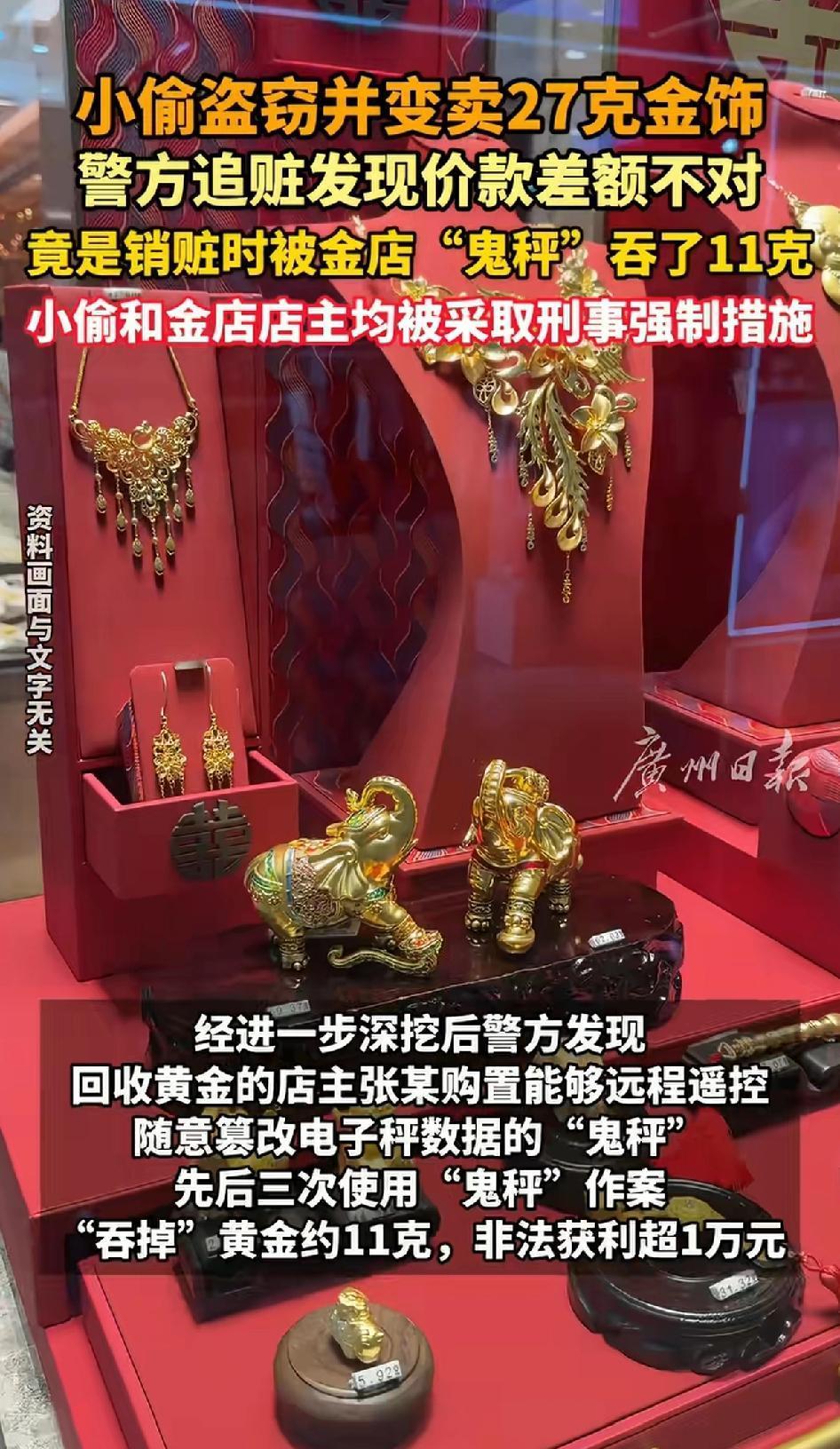 小偷盗窃并变卖27克黄金,警方追查发现价款差额不对,竟是销脏时被金店“鬼称”吞了11克。 最近株洲九郎山分局侦破了一起离奇“案中案”。小偷陈某沉迷网络赌博输光积蓄,趁罗女士一家外出旅游,用备用钥匙三次潜入其家中,盗走约27克、价值约2.8万元的金饰。警方迅速锁定并抓获了陈某。不劳而获的“贼”一到过年期间,就开始犯案。都不想不费吹灰之力挣钱。 然而追赃时却发现猫腻,陈某变卖黄金所得和金饰实际价值差距明显。进一步调查发现,回收黄金的店主张某用“鬼秤”作案。 他购置能远程遥控篡改数据的秤,三次“吞掉”陈某盗窃来的约11克黄金,非法获利超1万元。 这回收黄金的店铺,很贼一样,都是盗窃行为。 目前,陈某和张某都已被依法采取刑事强制措施,真是小偷遇黑店,双双落法网!