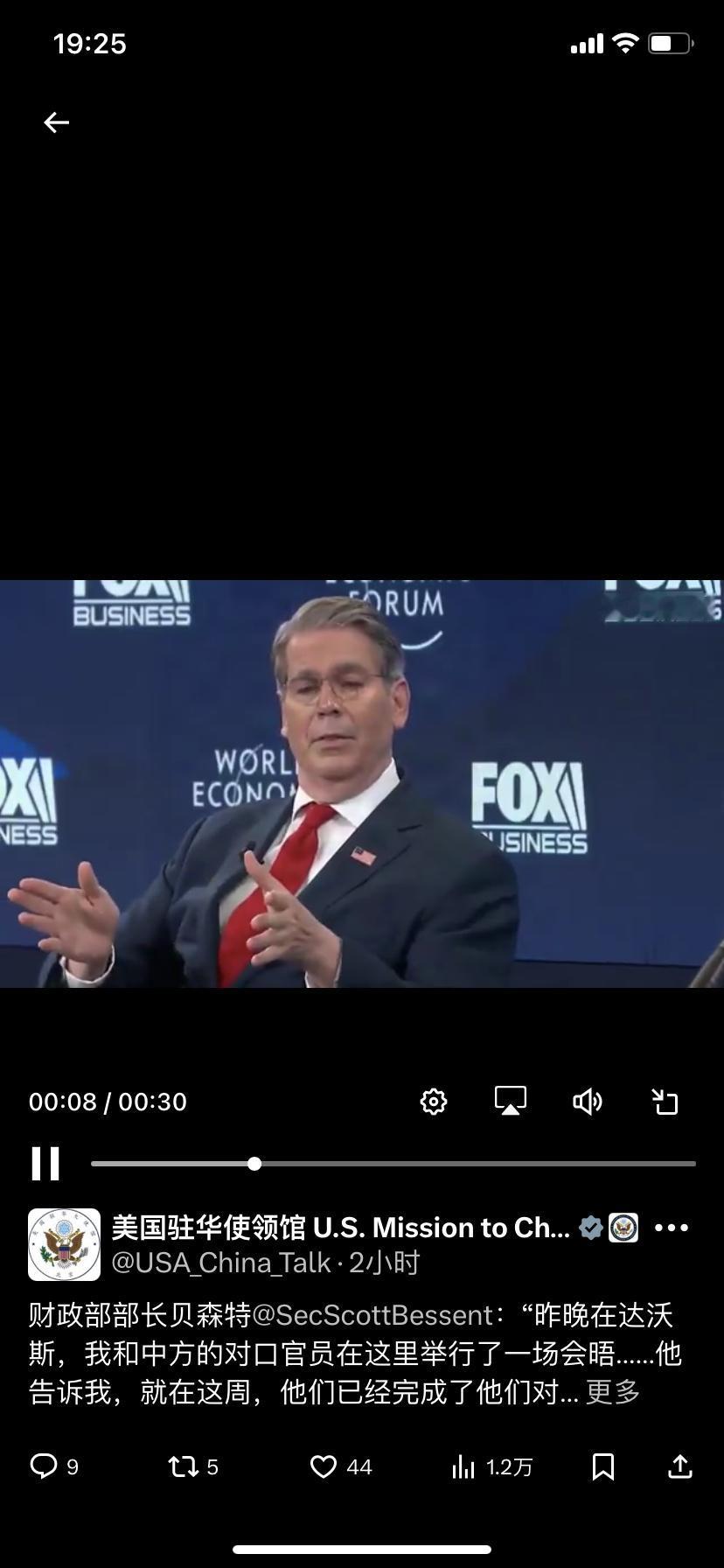 美国驻华使领馆今天(1月21日)写道:“财政部部长贝森特说:“昨晚在达沃斯,我和