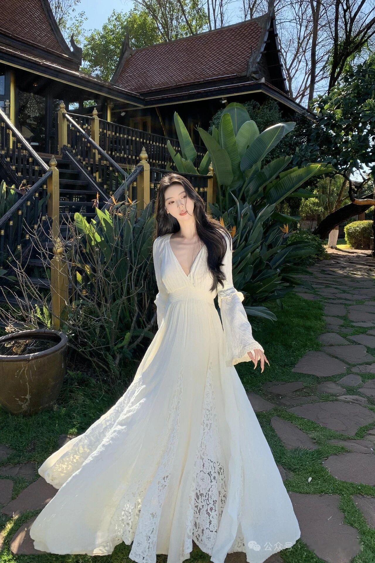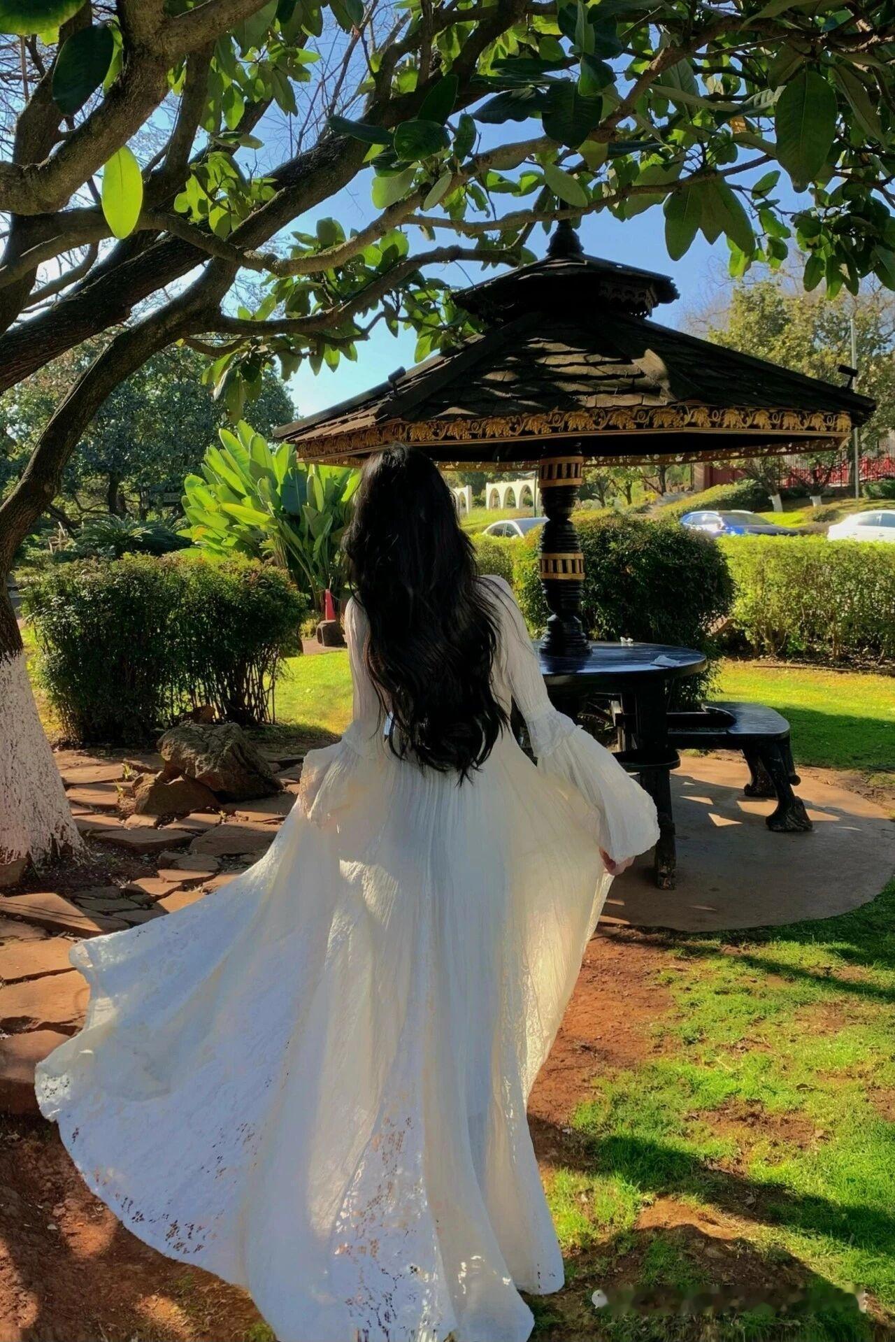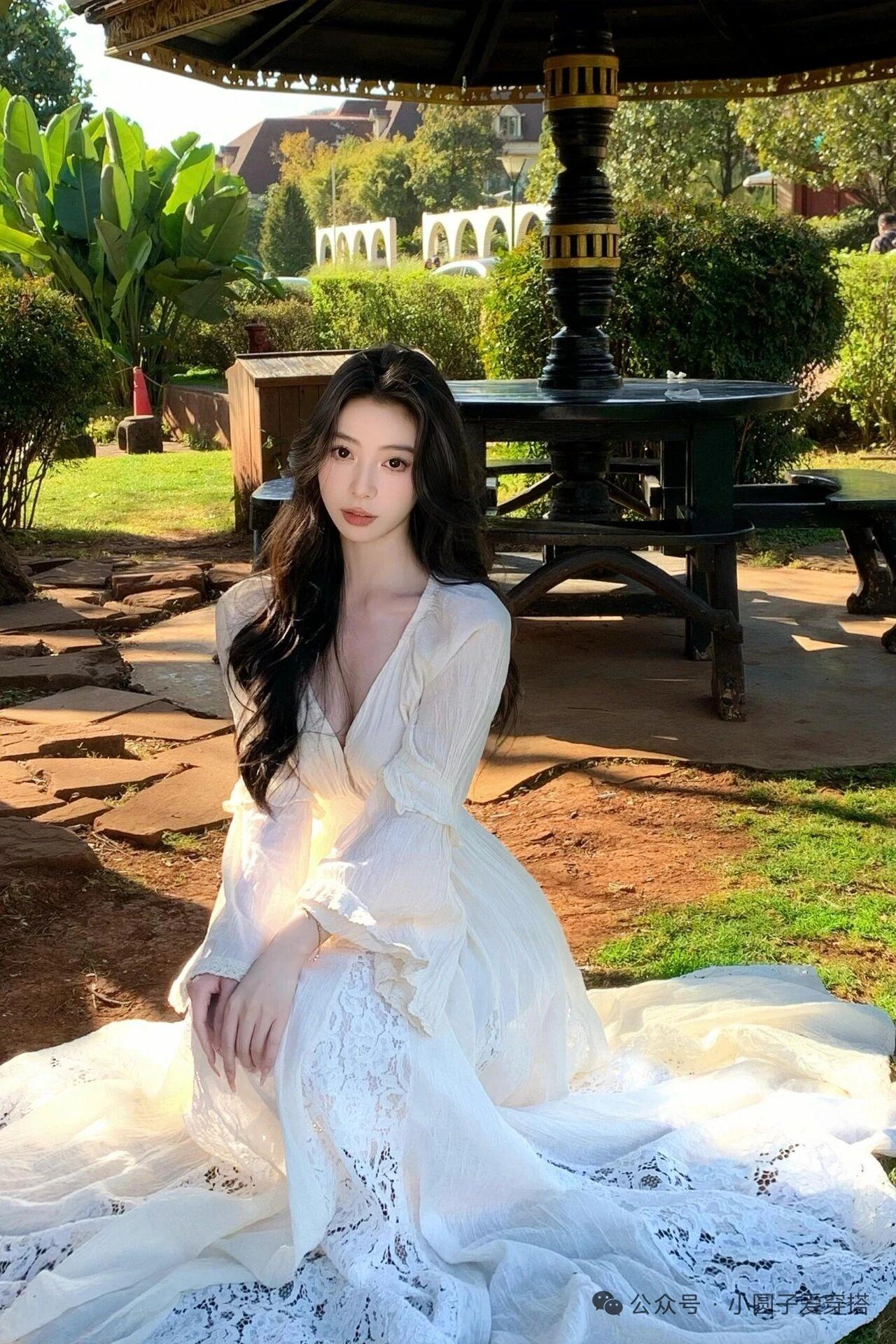 优雅白裙,绿意盎然,宛如童话中的公主。
