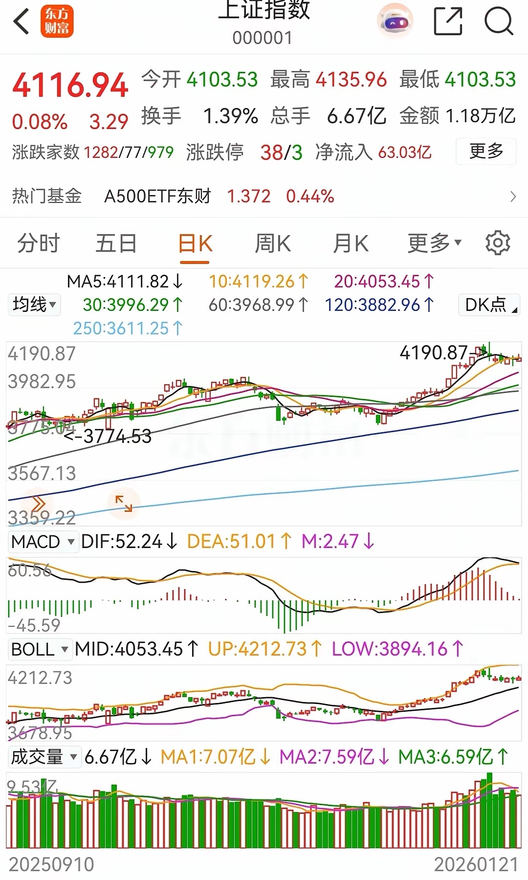 市场太强势了,差点就没有压住,这一点从 A股闭市后的港股恒生指数和恒指期货直线拉升来看,若无意外的话,明天高开无疑了!大盘今天低开后从4103点震荡走高,冲高到4135点后回落,之后开始震荡整理,下午两点后大盘指数有所回压,但是临近尾盘时无论如何打压,指数还是被拉红,其实我们闭市后港股的走势就表明为啥压不住了,明天有好戏看了,今天大盘最终收报于4116点,涨幅为0.08%。对于大盘明天的走势,暂看明天大盘将收出一根带上影线的阳线,具体的走势过程是,明天上午大盘先高开冲高,随后震荡回踩;下午大盘将先横盘,尾盘再次小幅拉升。当然了,这只是根据今天的收盘数据暂时做出的推测而已,仅供参考而已。